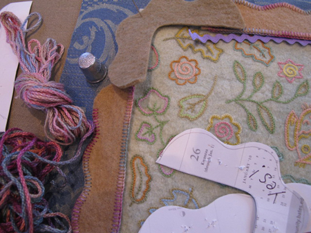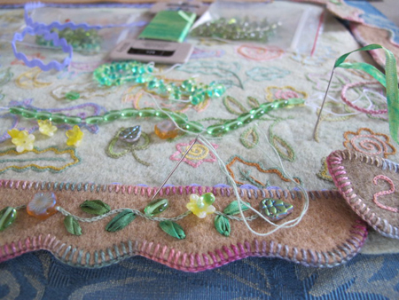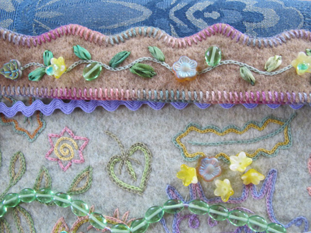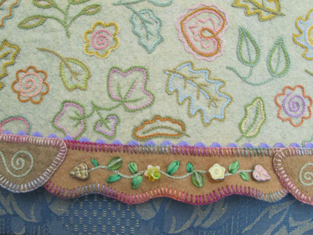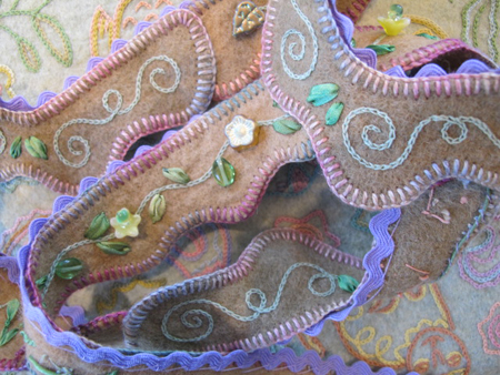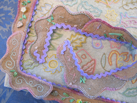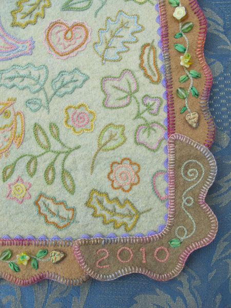 I then embroidered my initials and the date with some variegated dark purple raw silk thread. It called out for embellishment, so I started doodling along the border with light blue raw silk thread.