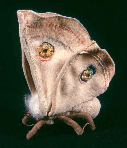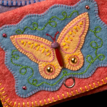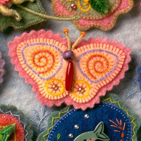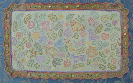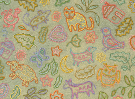 The new book, Pocketful of Posies: A Treasury of Nursery Rhymes includes many cats made in my new Halloween costume style. The head is a wooden bead, with face painting and a felt hood with ears attached. The cat’s paws and chest are whitened with acrylic paint. The fiddle is felt, with a thread-wrapped wire neck and bow. The illustration’s existing brown border was wide enough to cut in a wavy pattern, so I didn’t add another felt border. After several tries with different colors, I chose a blue pima cotton for the blanket stitched edging.
