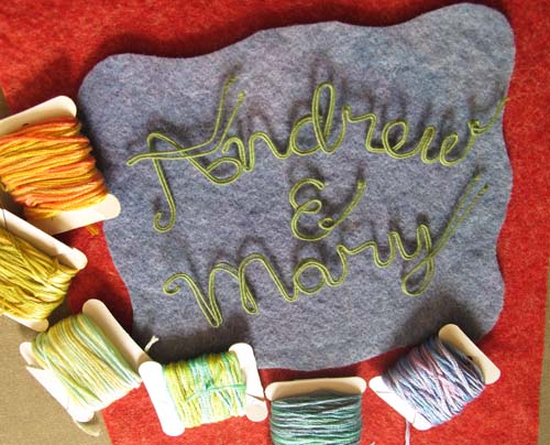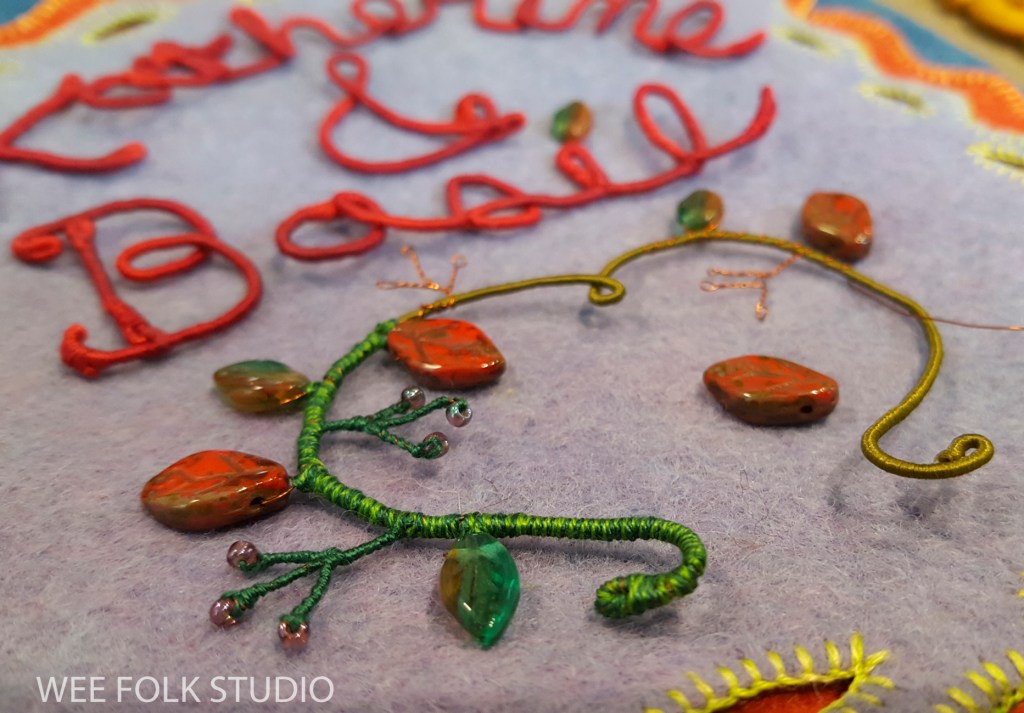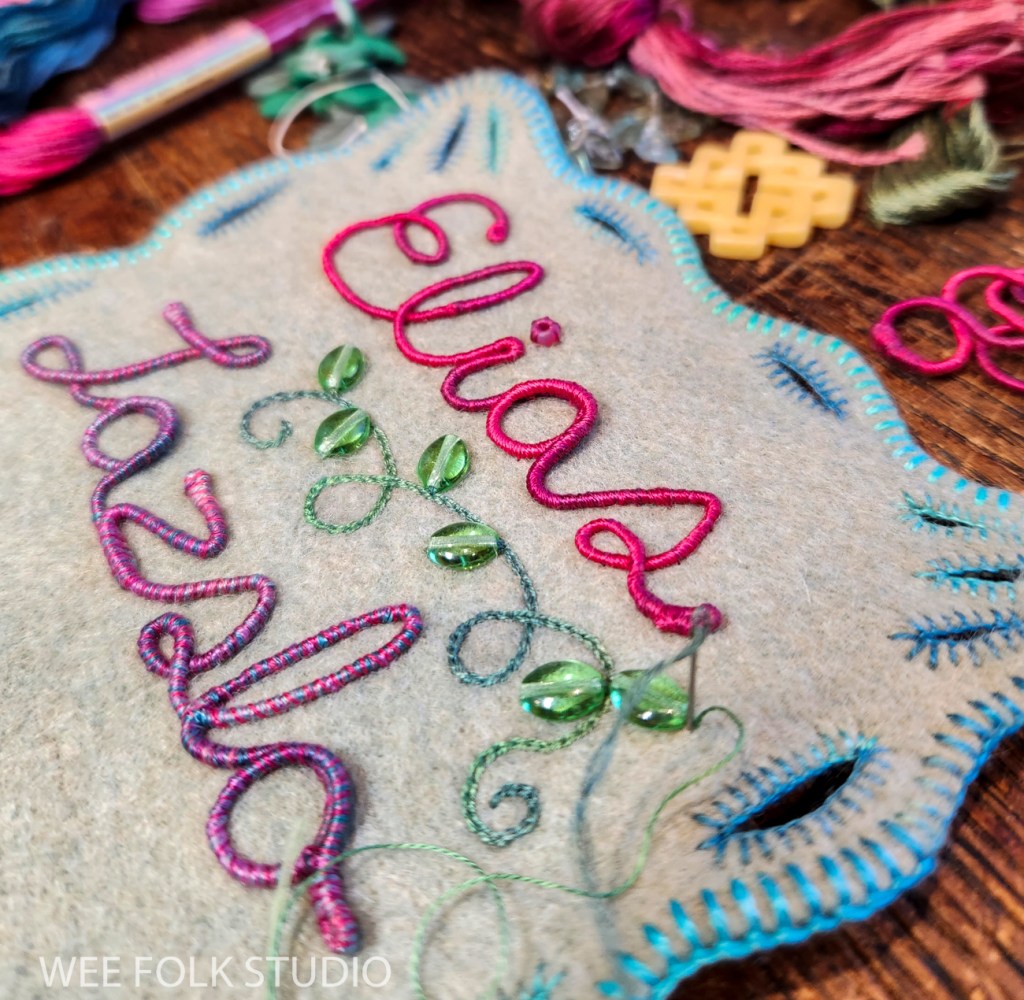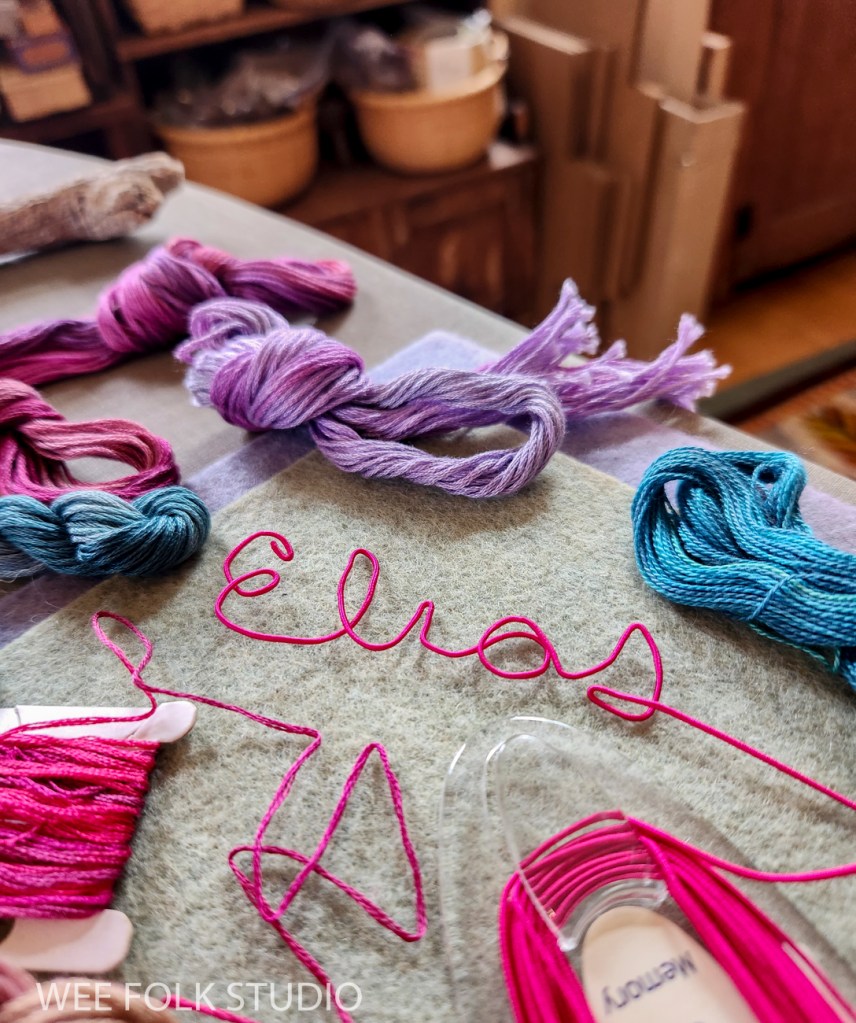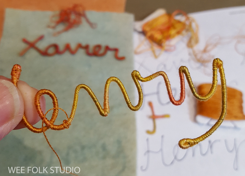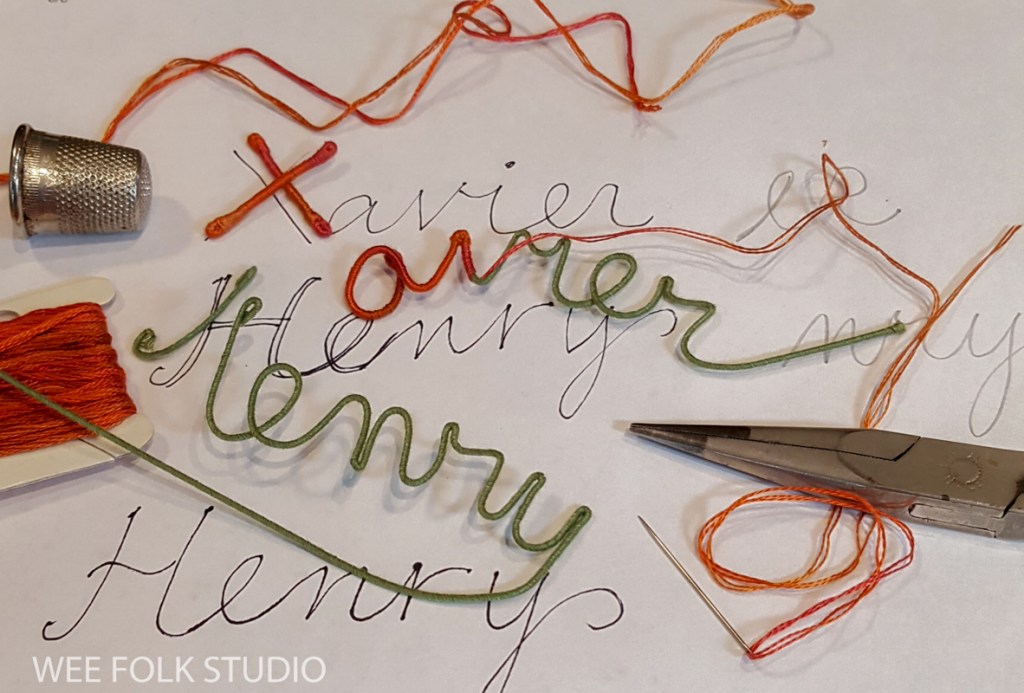 After choosing a color scheme and picking out pieces of felt and thread, I wrote out Eddie’s name in cursive handwriting with a pencil on paper. Fortunately, his name could be written in one continuous line, which doesn’t always happen. I then wrapped a length of DMC memory thread (a kind of wire) with 3 strands of variegated embroidery floss (see video below). Using the drawing as a template, I bent the wire to form his name and stitched the letters together where they touched.