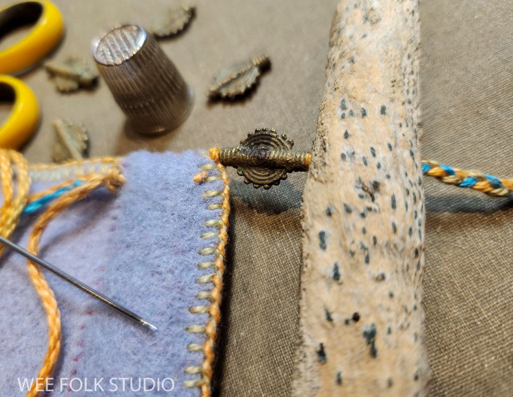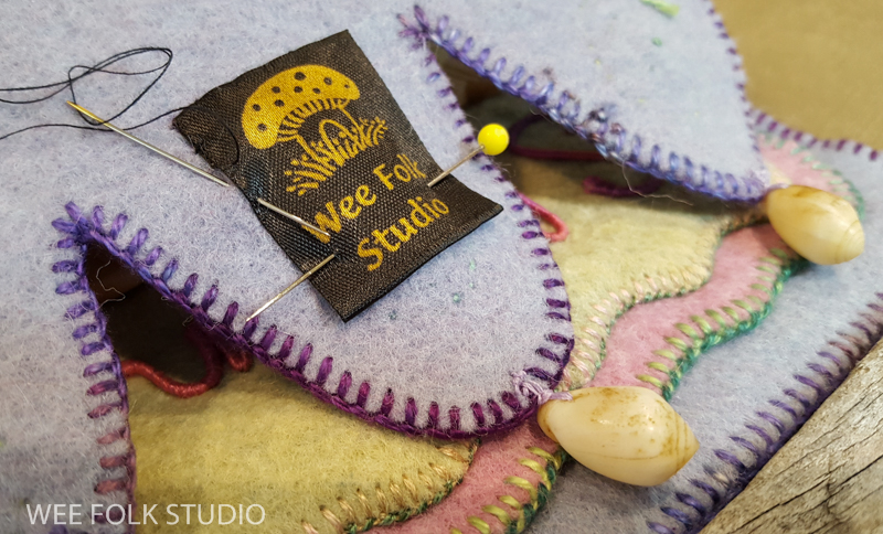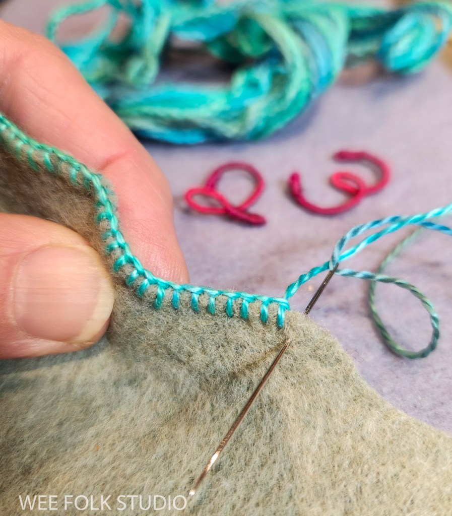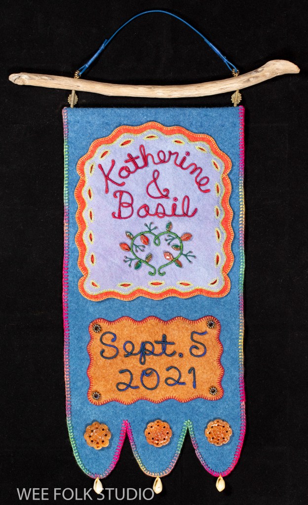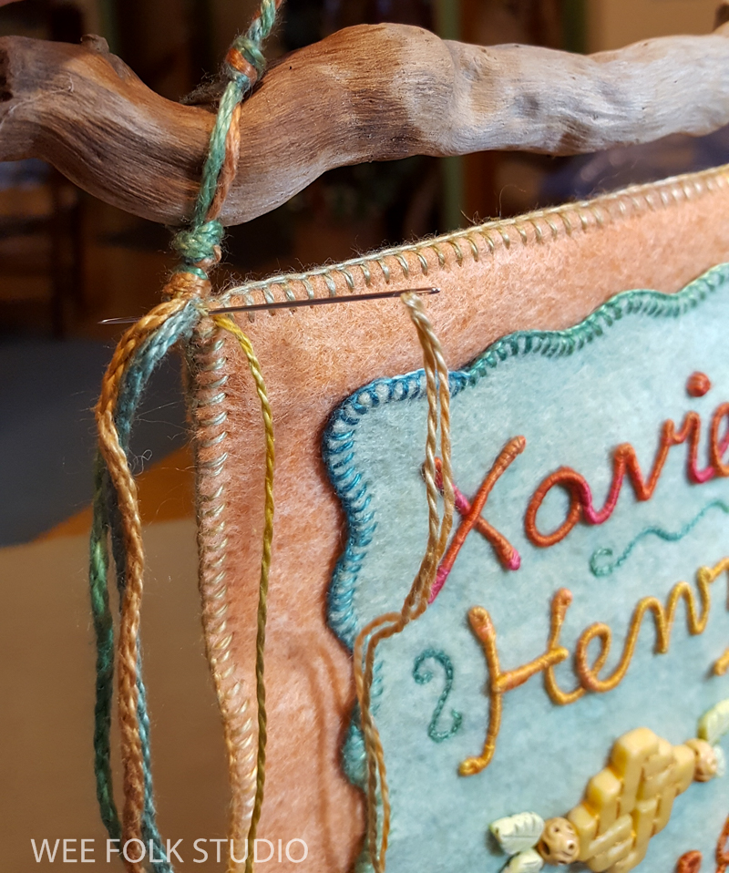 I love embellishing with blanket stitching, especially with variegated thread. It’s a simple, but effective way to create an edge that looks clean and assertive, while also displaying a handmade quality. For me, it’s important to show that a real person made it, not a machine. For this banner, I created layers of felt pieces, which I blanket stitched with pima cotton (Watercolours by Caron).