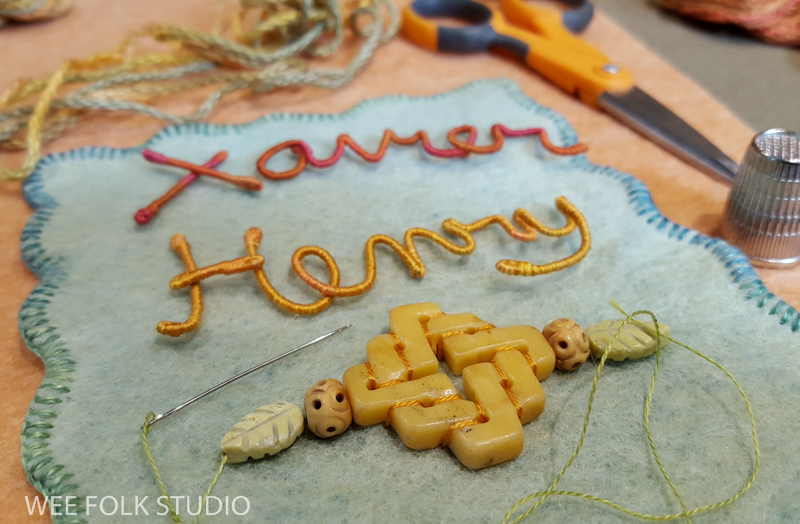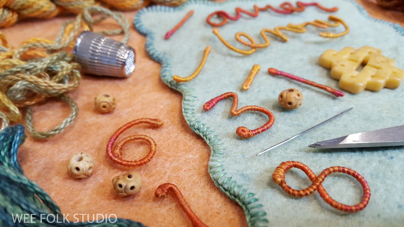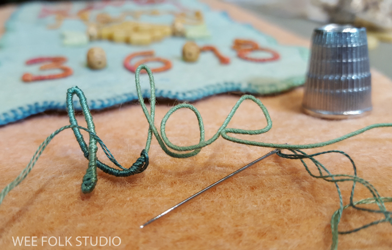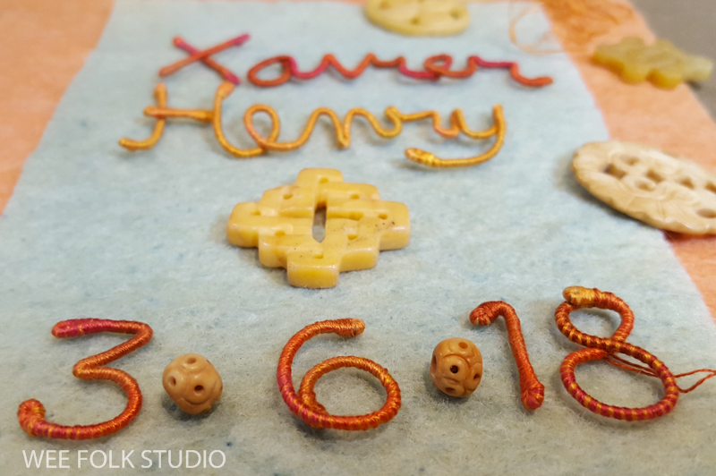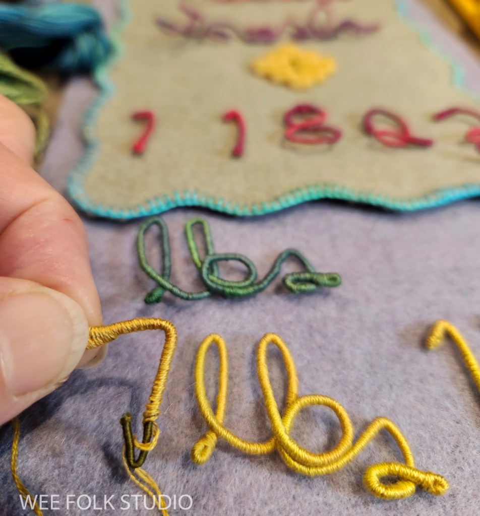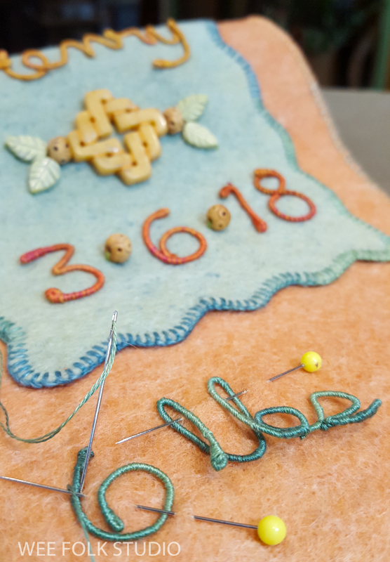In this video, I demonstrate wrapping DMC memory thread with 3 strands of embroidery floss to create numbers and letters for Eddie’s birth weight. I thought it would be easier to see the process using contrasting wire and thread colors. Of course, using the same color wire and thread is better for hiding gaps and inconsistencies. It takes a lot of practice to get the hang of wrapping the wire. If you’ve learned to wrap arms and legs for the wee folk dolls in my how-to book, Felt Wee Folk, you’ve got a jump start on mastering this technique.