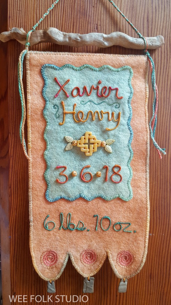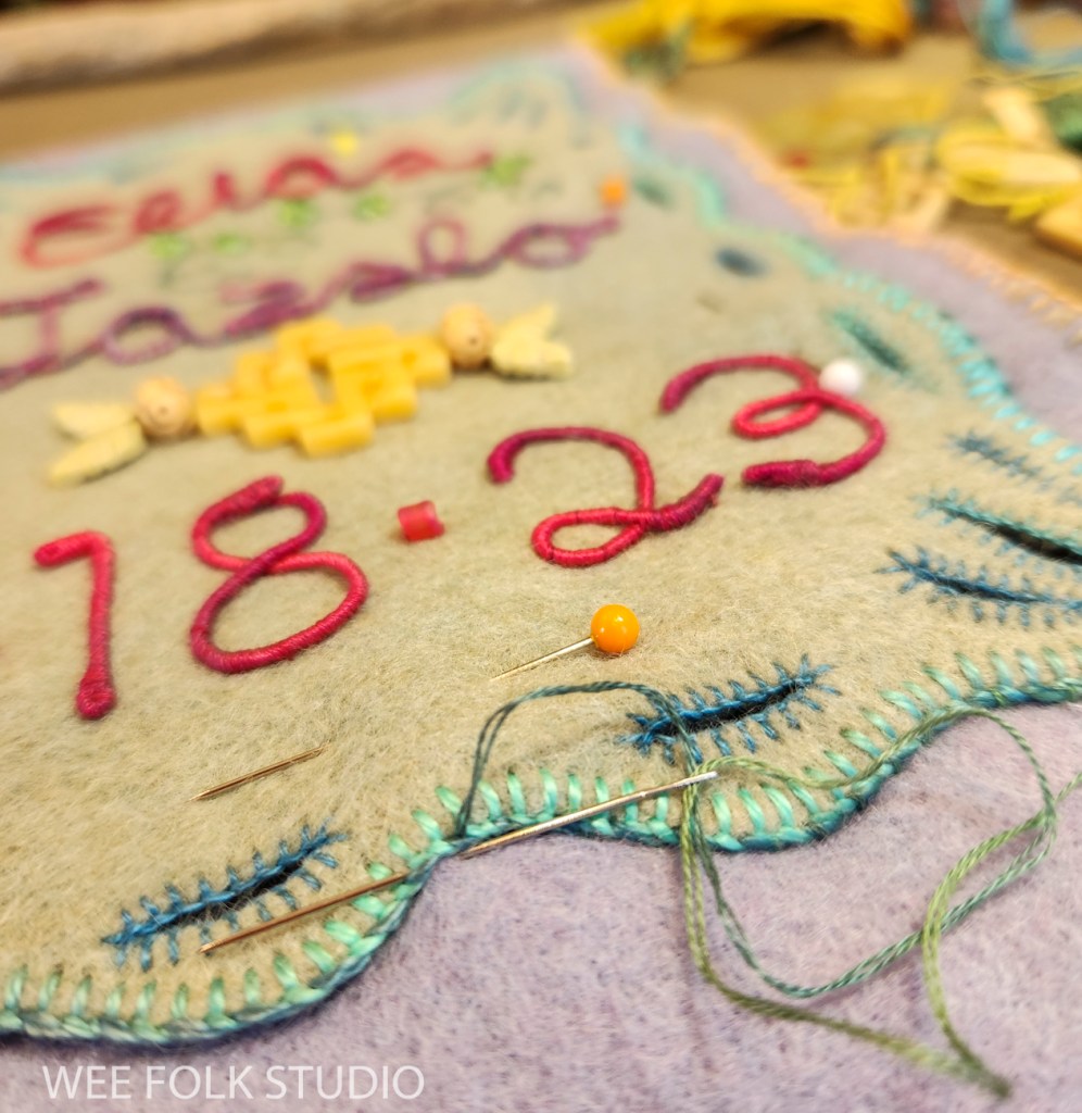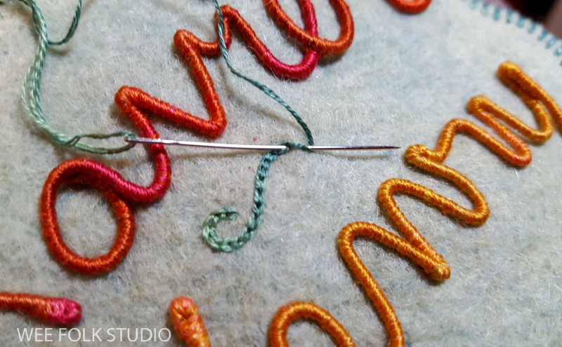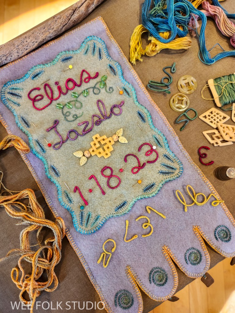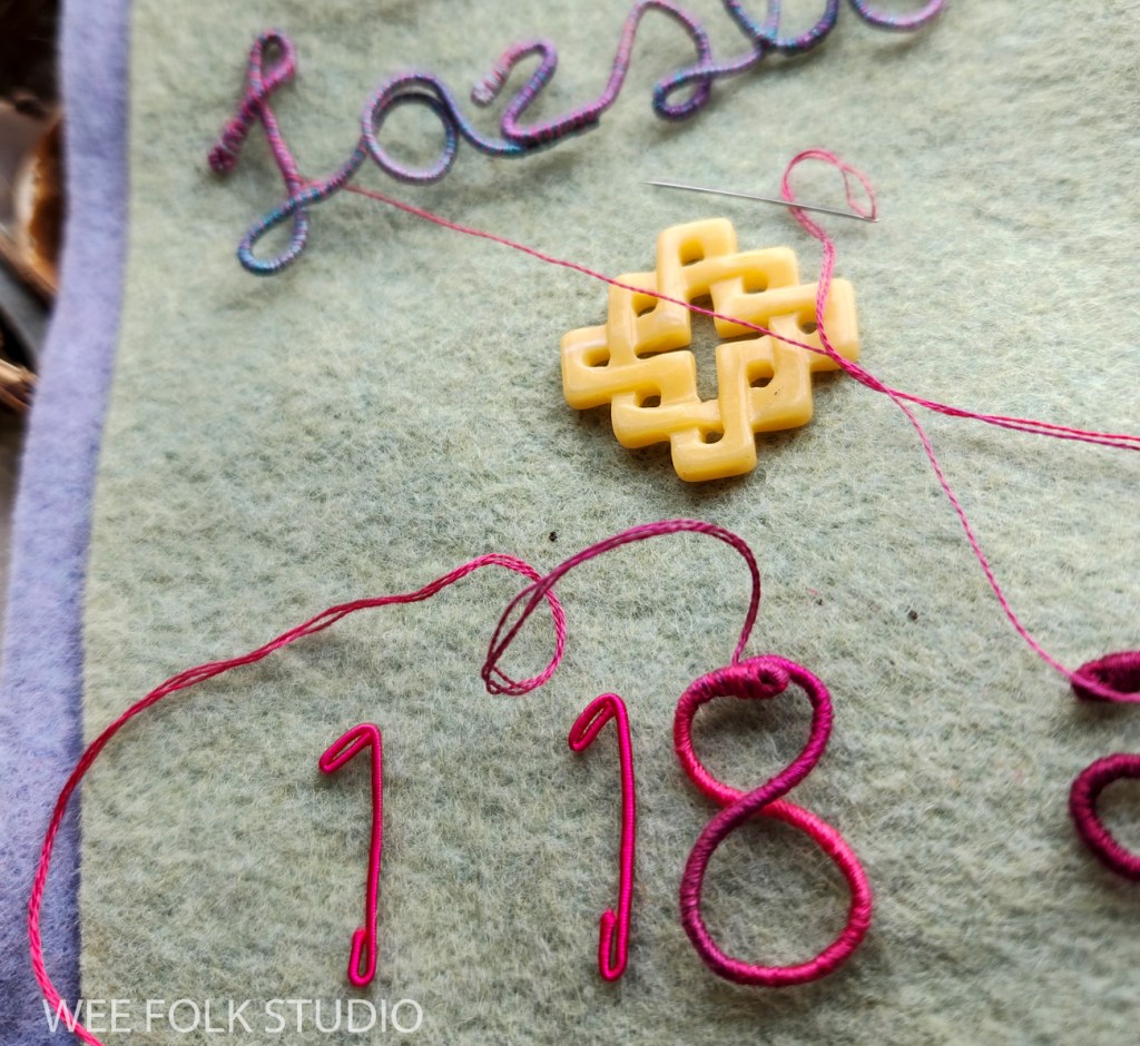 In this video, I demonstrate wrapping DMC memory thread with 3 strands of embroidery floss to create numbers and letters for Eddie’s birth weight. I thought it would be easier to see the process using contrasting wire and thread colors. Of course, using the same color wire and thread is better for hiding gaps and inconsistencies. It takes a lot of practice to get the hang of wrapping the wire. If you’ve learned to wrap arms and legs for the wee folk dolls in my how-to book, Felt Wee Folk, you’ve got a jump start on mastering this technique.