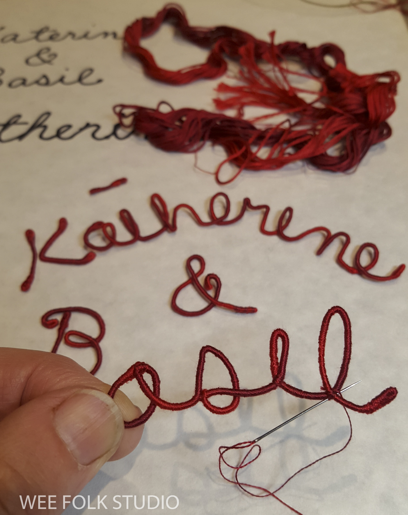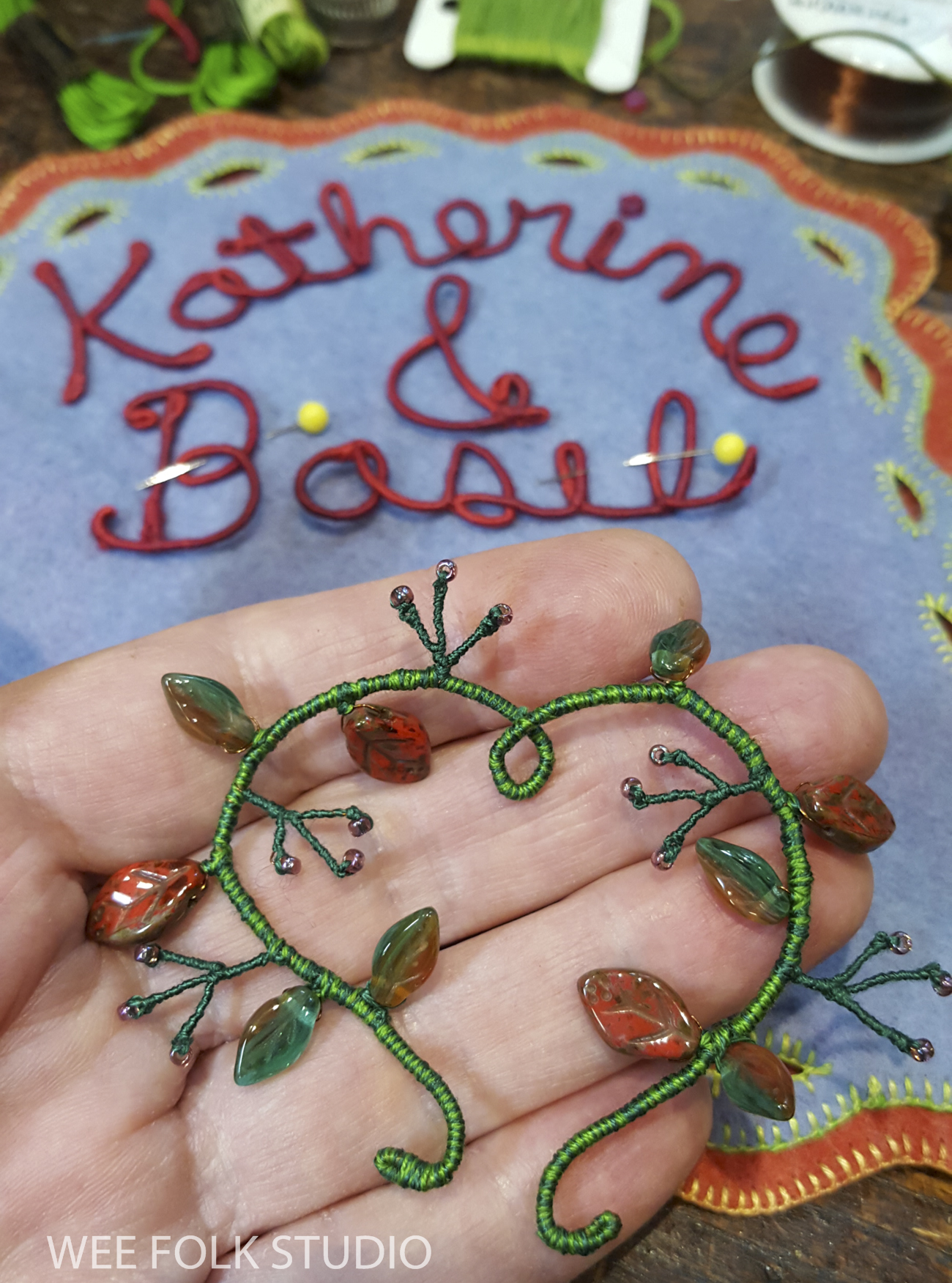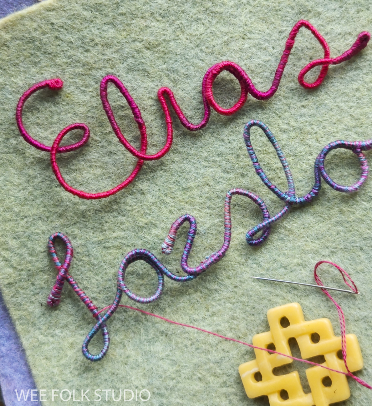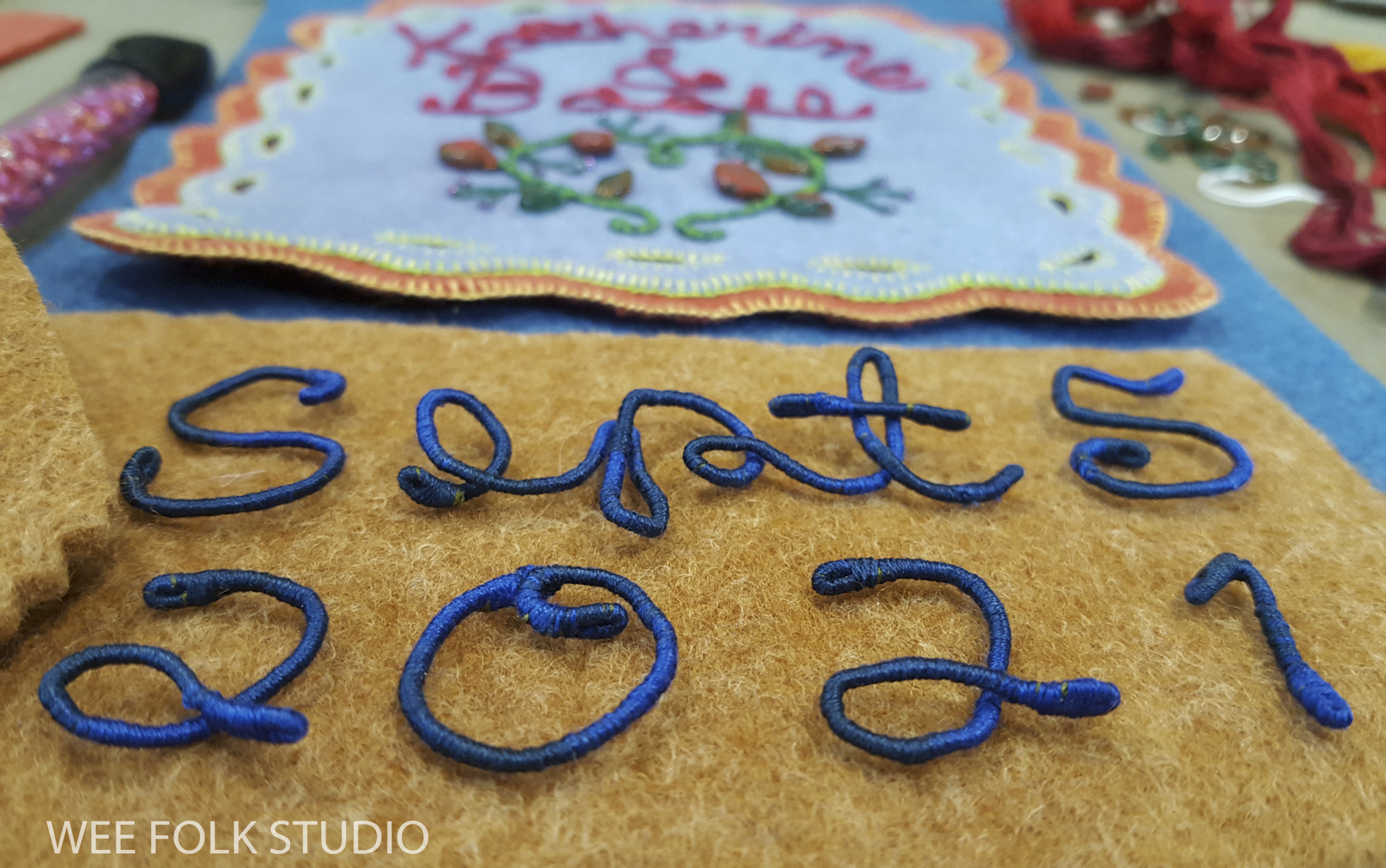 After choosing a color scheme and picking out pieces of felt and thread, I wrote out Eddie’s name in cursive handwriting with a pencil on paper. Fortunately, his name could be written in one continuous line, which doesn’t always happen. I then wrapped a length of DMC memory thread (a kind of wire) with 3 strands of variegated embroidery floss (see video below). Using the drawing as a template, I bent the wire to form his name and stitched the letters together where they touched.