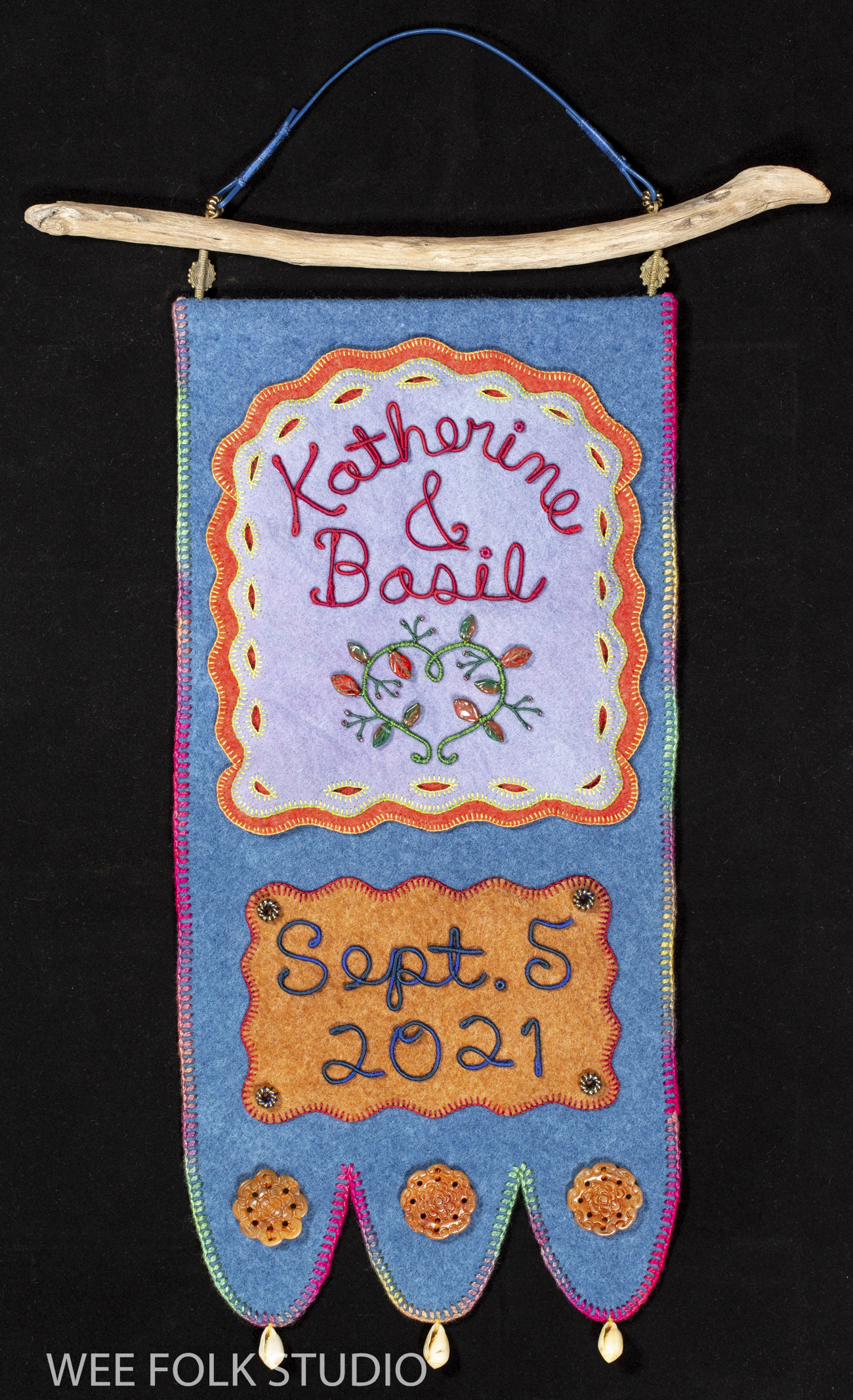 I love embellishing with blanket stitching, especially with variegated thread. It’s a simple, but effective way to create an edge that looks clean and assertive, while also displaying a handmade quality. For me, it’s important to show that a real person made it, not a machine. For this banner, I created layers of felt pieces, which I blanket stitched with pima cotton (Watercolours by Caron).