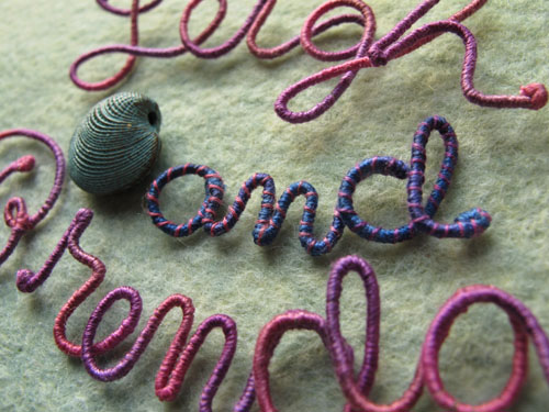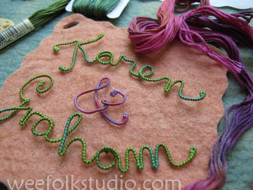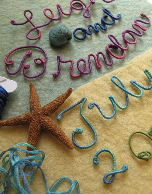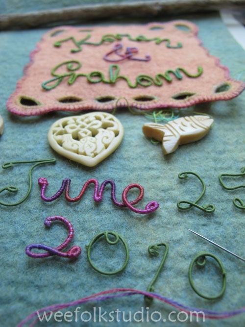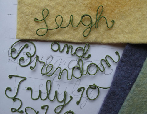 I started by bending 32 gauge cloth-covered wire to form the names and wedding date. I’m really having fun bringing language into my artwork this way. I started figuring out this technique a few years ago when I was working on Pocketful of Posies, and have no idea if the same kind of thing has been done before. Once you get into the rhythm, the wrapping goes quite fast. After all those years wrapping fuzzy pipe cleaners with embroidery floss for fairy limbs, this seems easy.