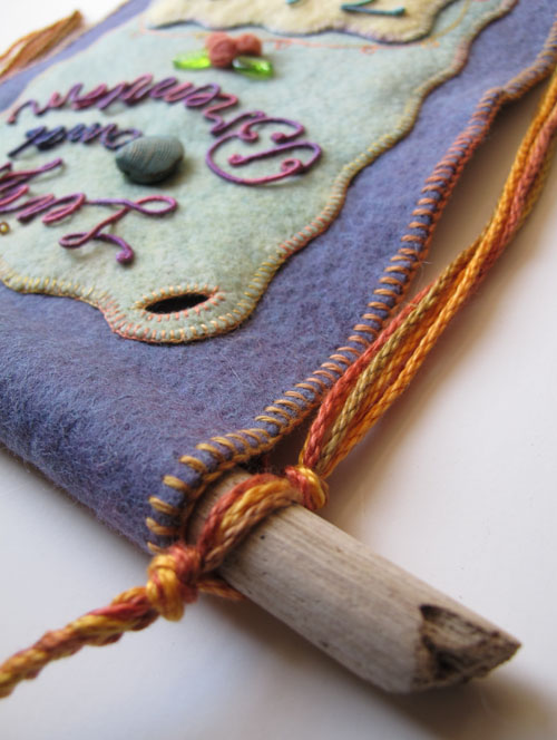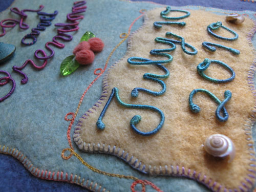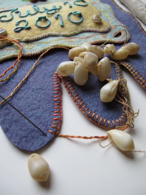 I decided to incorporate a more conventional floral decoration and added some of Mimi’s Kirchner’s felt roses and some glass leaf beads. If you haven’t learned how to make them yet, go to her tutorial on her blog here. I also got out the dreaded glue because that was the only way to attach some shells around the date. The yellow felt piece called out for some embellishment, so I added a chain-stitched loopy line around it.