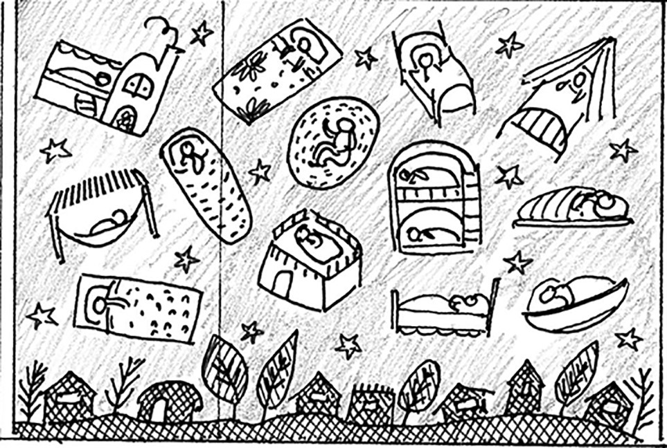 This is a different interpretation of the child who appears several times in the book – on the title page and in the scene that shows a house full of animal icons. The orange pajamas and star covered quilt are the giveaway.