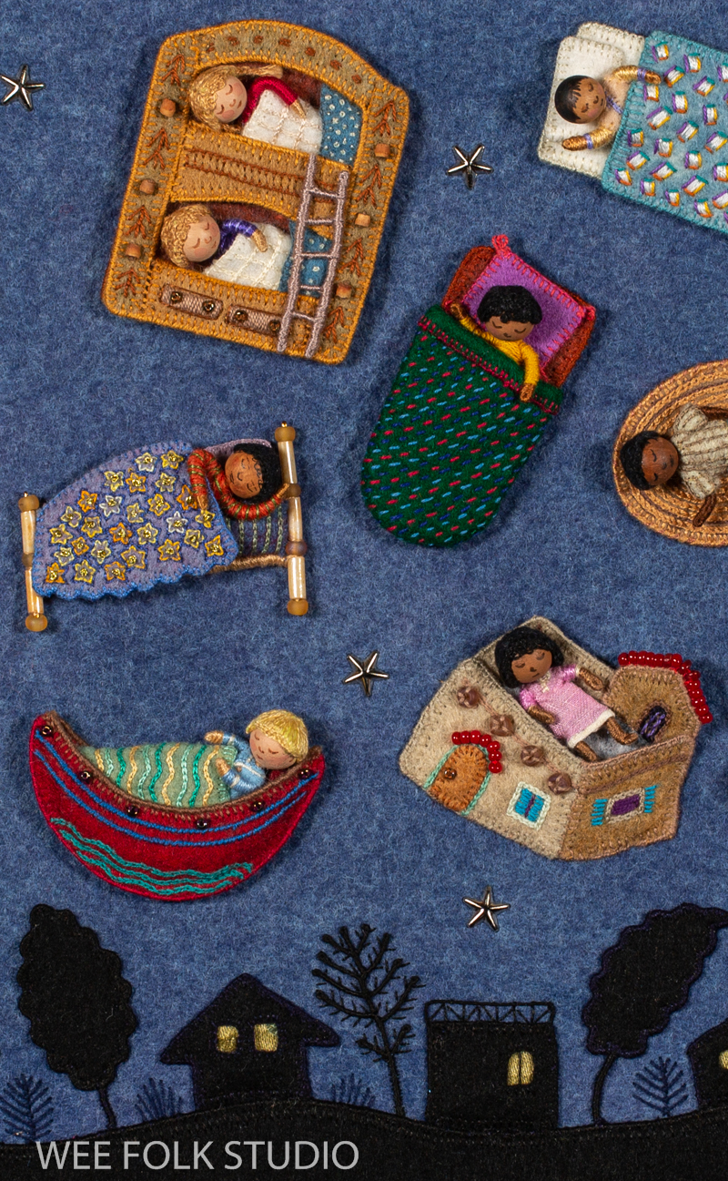 Then, I started making miniature versions of the characters and beds pictured throughout the book. Since they are so tiny, I simplified the designs to include important and recognizable features. This one represents the child sleeping on the roof in the North African scene.