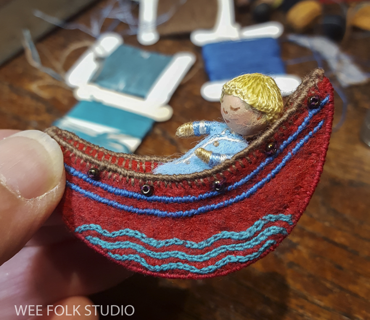 For the boy in the scene set in Holland, I didn’t even try to duplicate the houseboat in such small scale, but instead made a boat bed for him to sleep in.