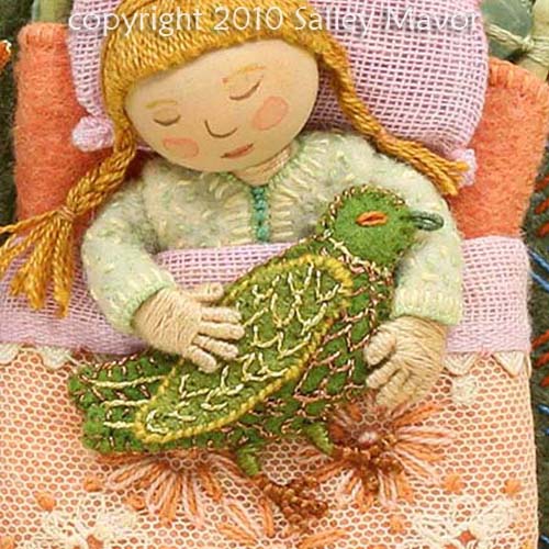 People ask how I can sell my originals, because of the amount of work that goes into them. The simple answer is – it’s not hard to let them go. For me the joy comes from making more than having. It’s good to spread them around! There are practical considerations as well. Selling originals is how I’m paid for my work, since book royalties aren’t much. I also need to clear space to fill with new art, both physically and mentally. That said, I’ve kept pieces that have a special meaning and I’m holding onto some of my newer pieces, so that they are available to exhibit. The original illustrations for my upcoming picture book, My Bed: Enchanting Ways to Fall Asleep around the World will eventually be offered for sale, after the touring exhibition, Salley Mavor: Bedtime Stitches.