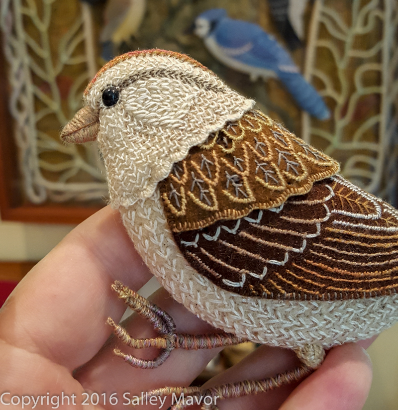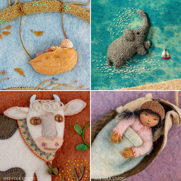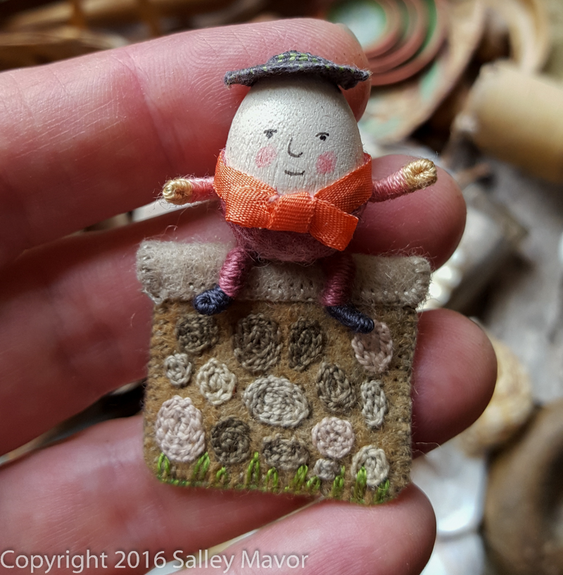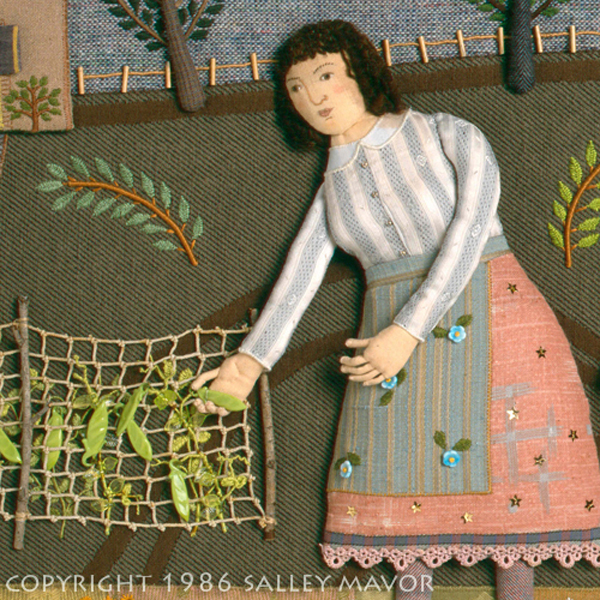 For the past few weeks, I’ve been gathering my embroidered artwork from local collectors who are generously loaning their pieces for my upcoming exhibition, Salley Mavor: Once Upon a Thread at the Cape Cod Museum of Art (Dec. 12, 2019 – Jan. 16, 2020). The retrospective exhibition will include original illustrations from my picture books, from the first (The Way Home,1991) to the latest (Pocketful of Posies, 2010). Between the borrowed ones and others that I’ve kept, there will be lots of original pieces on display, with a dozen titles represented. This show will be an opportunity for visitors to see the detail and 3-dimensional quality of my artwork in person and also view pieces from private collections that are rarely shown in public.