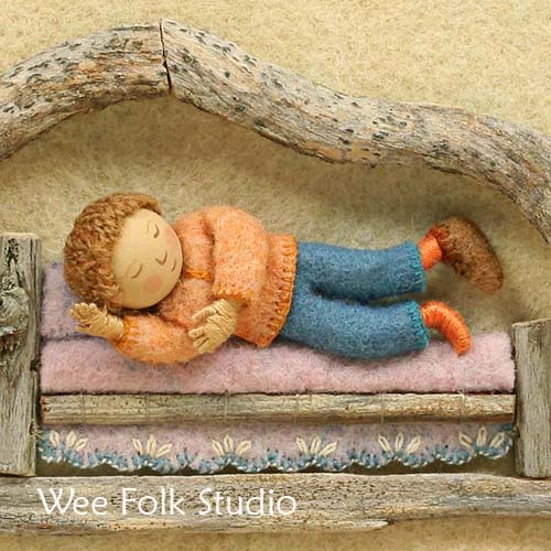 My book, Pocketful of Posies: A Treasury of Nursery Rhymes has many different scenes with beds. After his fall, Jack took to bed and wrapped his head with vinegar and brown paper. And Hush-a-bye-baby rocks in a walnut shell.