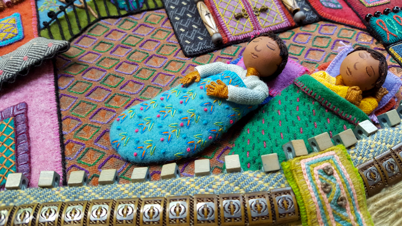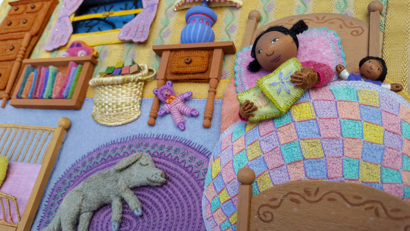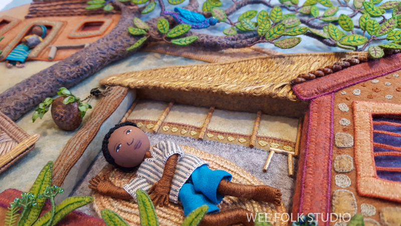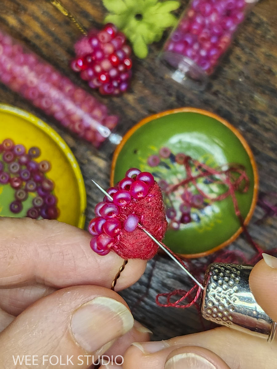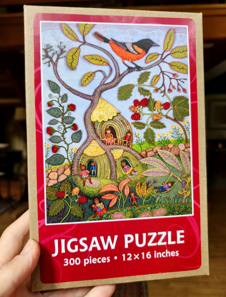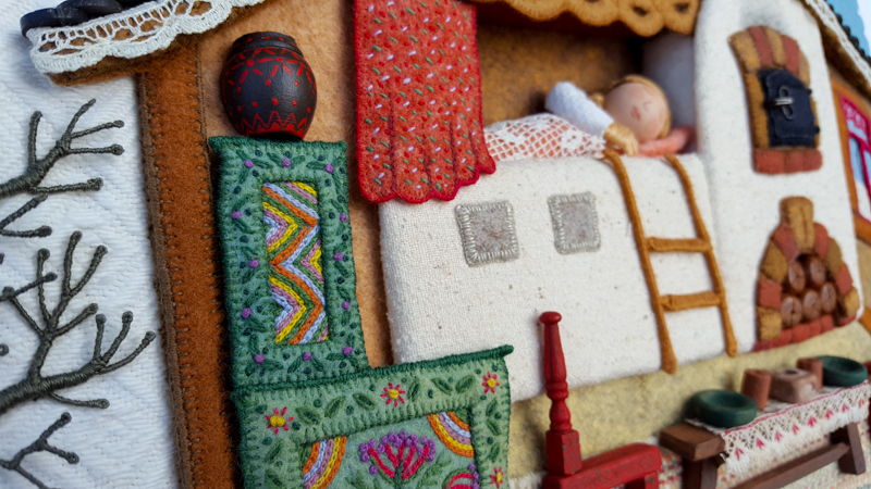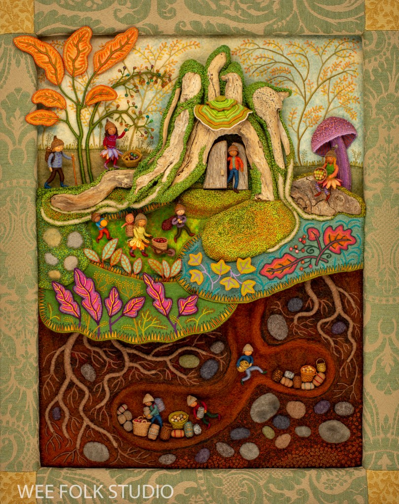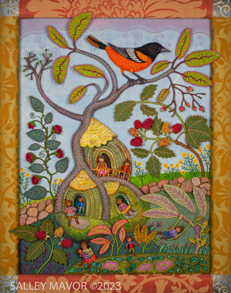 As promised, I’m picking up where we left off last year and continuing the series about Summertime, the fourth of my seasonal landscapes. In the coming months, I’ll share photos, videos and commentary about different aspects of the project, from raspberries to wee folk inhabitants to a life size Baltimore Oriole. I went overboard documenting the process, so there’s a ton of material to show. So far, I’ve written an overview of the piece, Part 1 – Tree Trunks, and Part 2 – Tree Houses, Part 4 – Baltimore Oriole (body) , Part 5 – Baltimore Oriole (head and feet), Part 6 – rose vine , Part 7 – raspberry plants, and Part 8 – stitching flora..