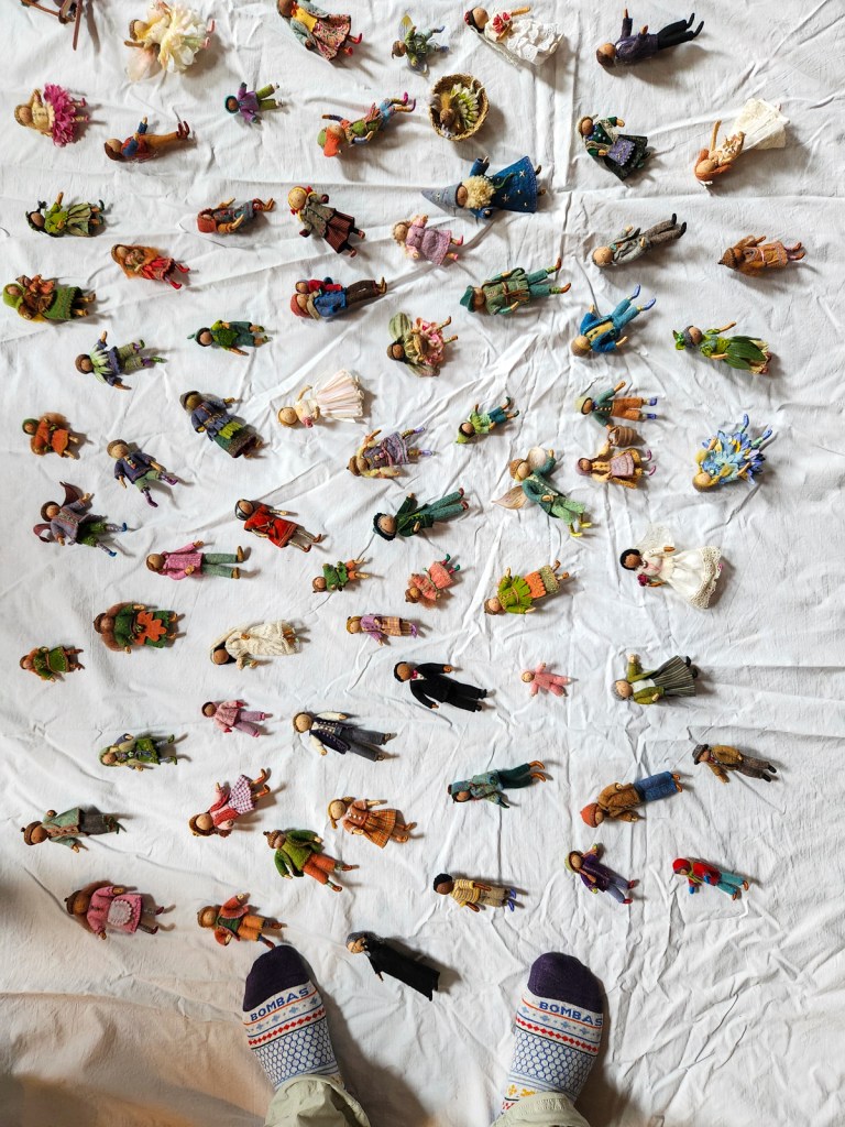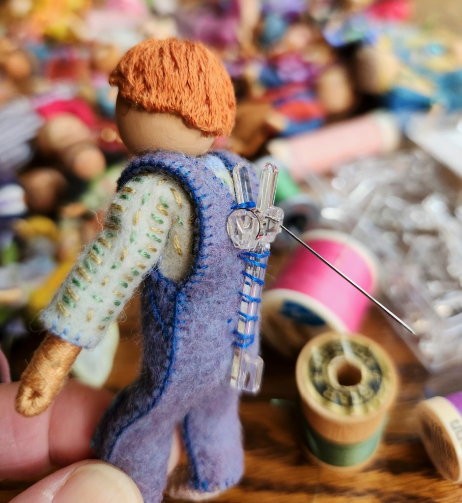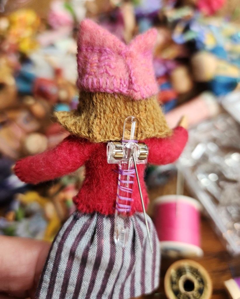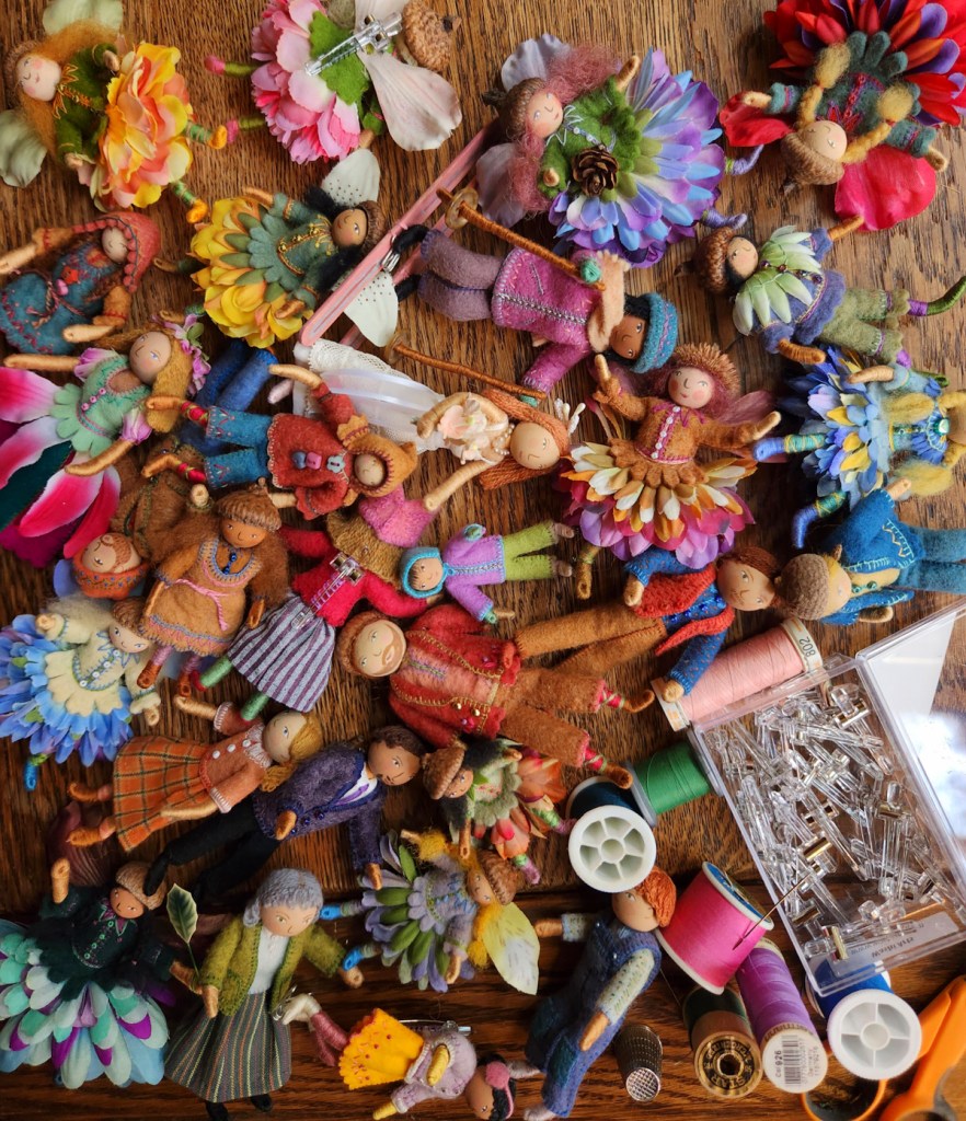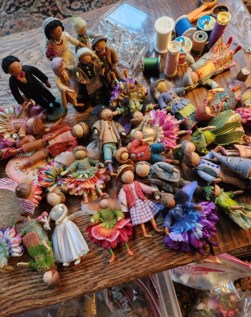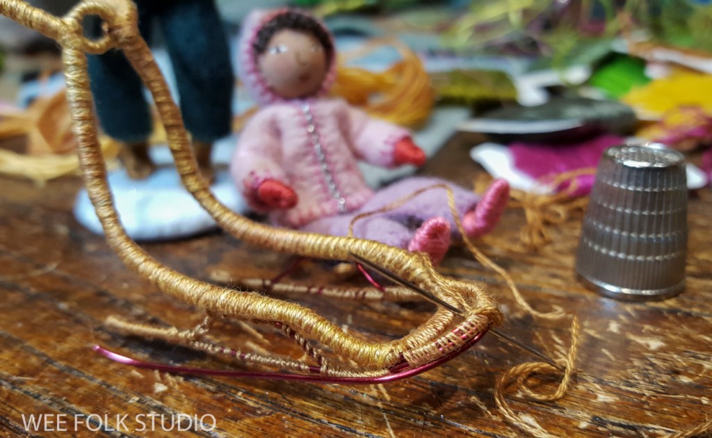 After years of developing ways of making tree branches, my preferred method these days is forming wire armatures and covering them with felt or embroidery floss. I usually embroider a textured “bark” pattern onto the felt before sewing it around the wire. Thicker tree trunks involve a different process, which I wrote about in Part 1.