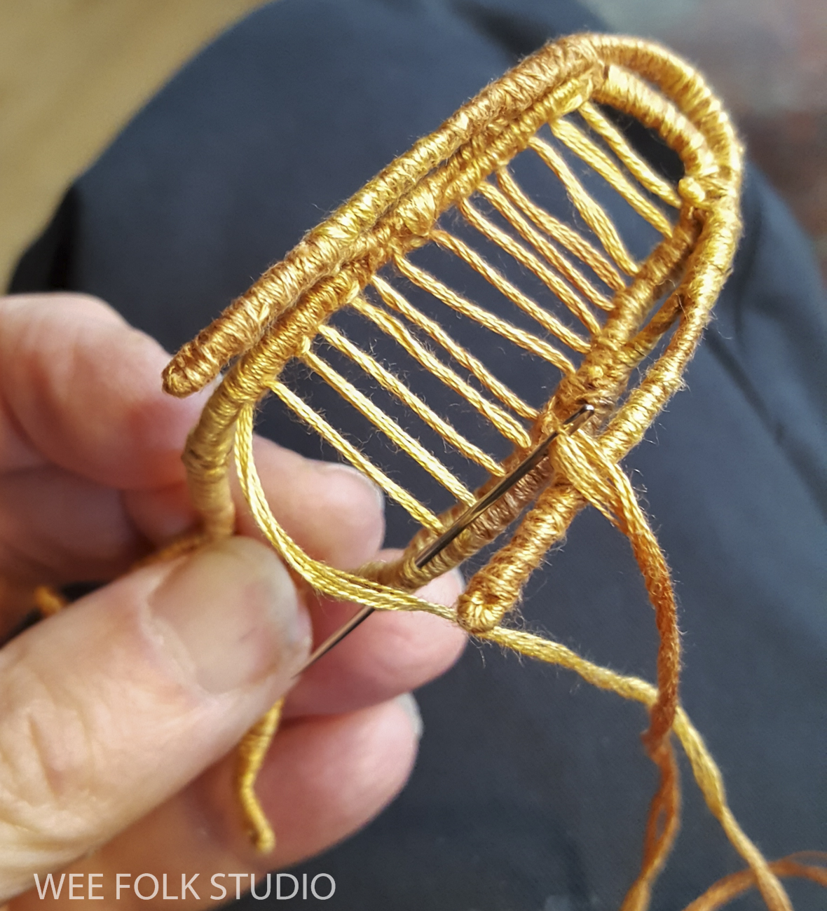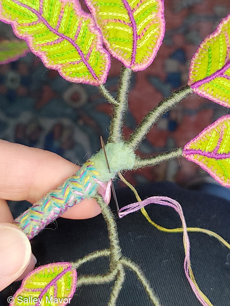 In the following video, you can see how I stitched felt to cover the section that branches off into 3 separate wire limbs.