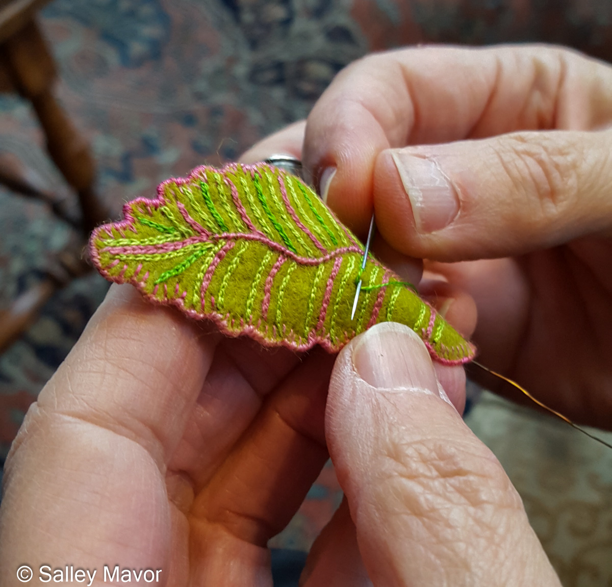 Wire is literally the backbone of my work. I use it as a structural framework to keep floppy materials (like felt) firm enough to exist in space, above the background fabric. In this piece, I used copper wire made by Parawire to edge the leaves and form their stems.