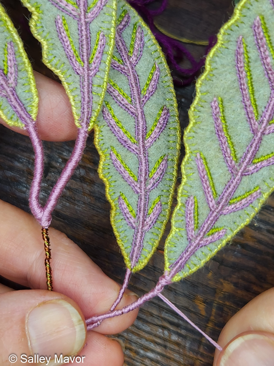 I made the leaves with 3 basic materials – wool felt, wire, and embroidery floss. The following Stitch Minute video demonstrates how to make a simple leaf, edged in wire.