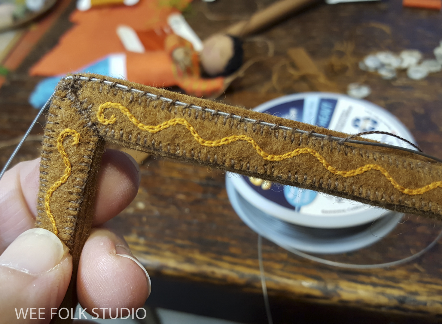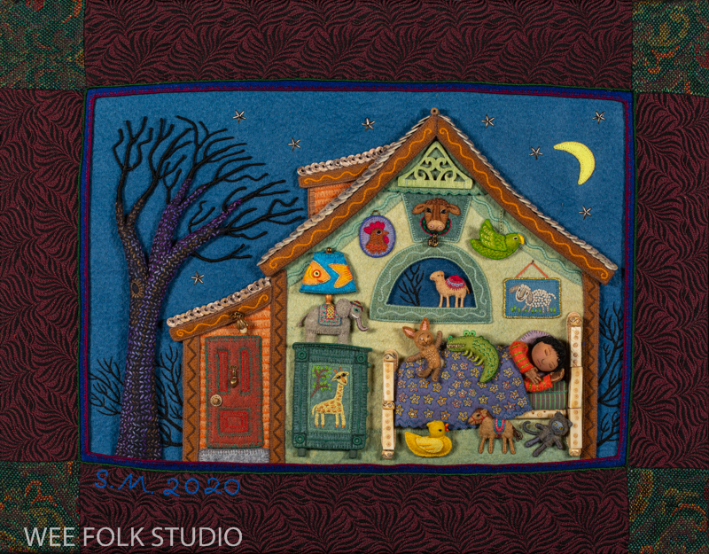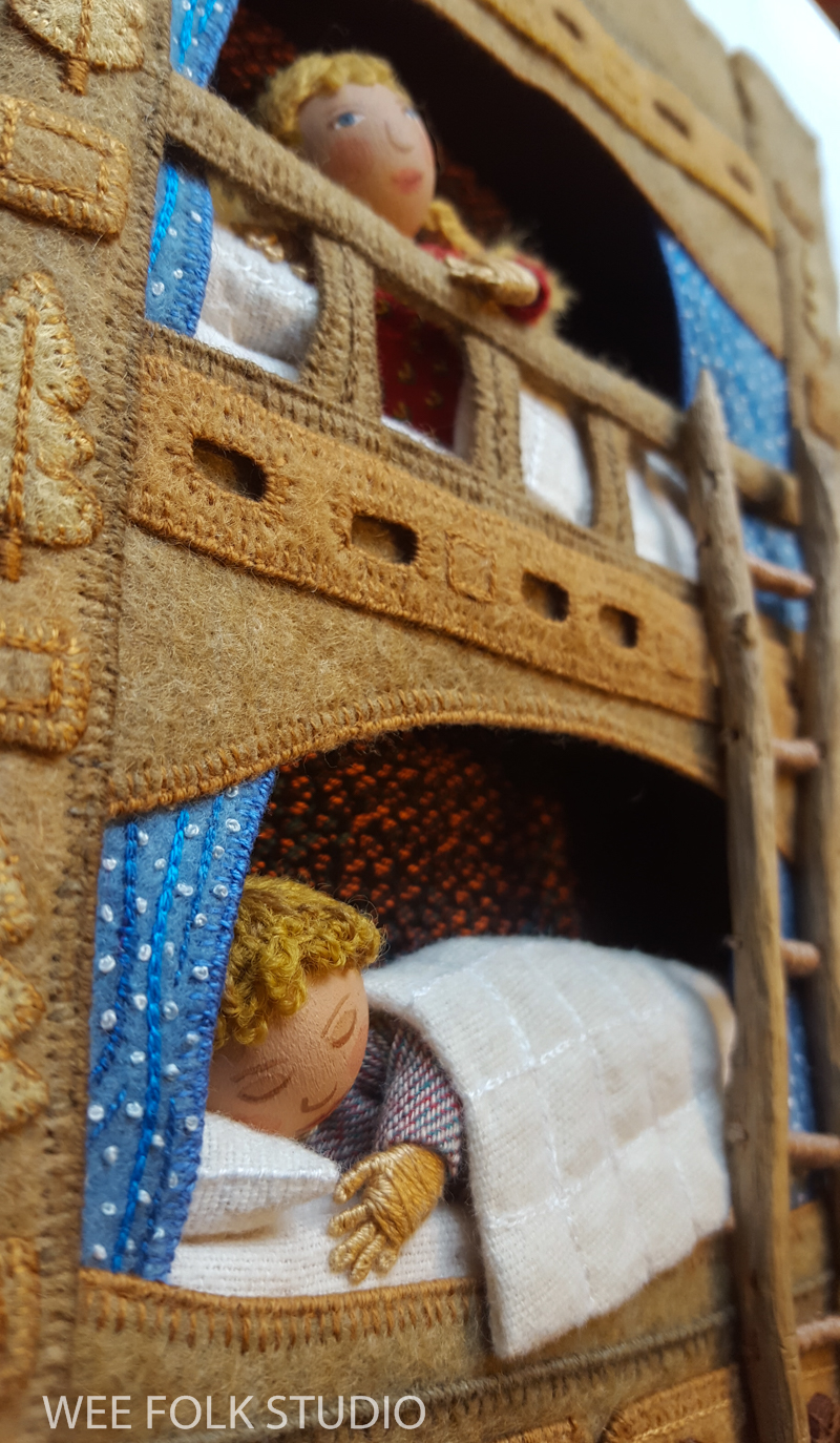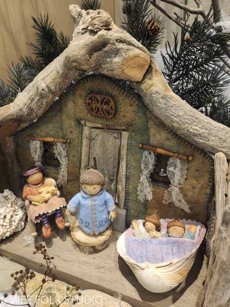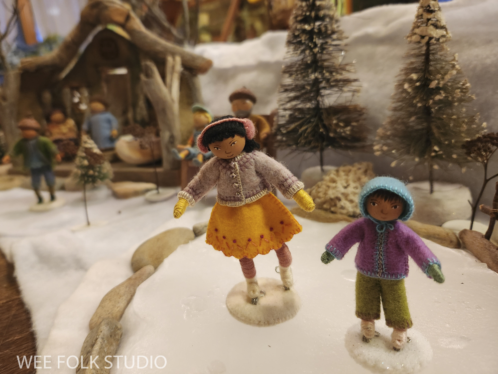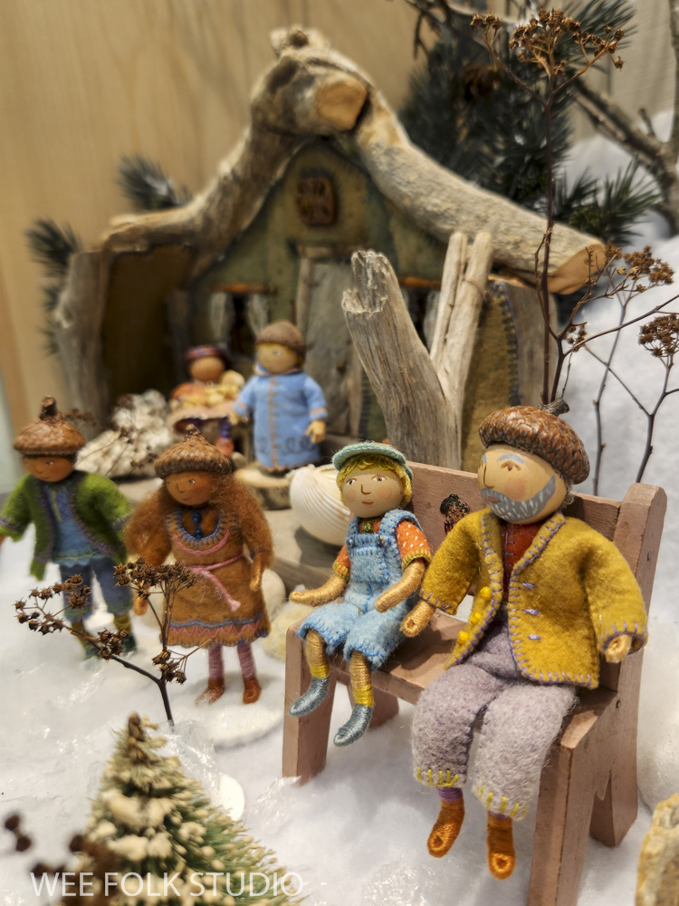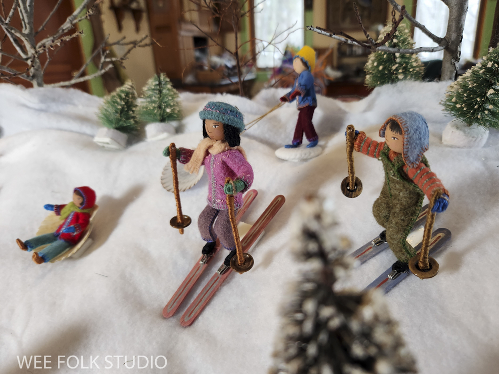The snow scene is populated with sample dolls from the Winter Play chapter of my how-to book, Felt Wee Folk: New Adventures. The book includes instructions for making the dolls and stands like the ones I used in this scene.