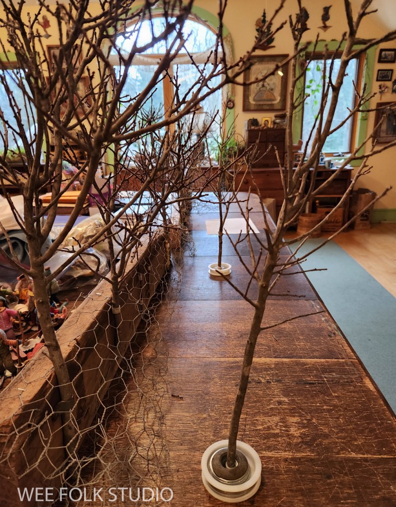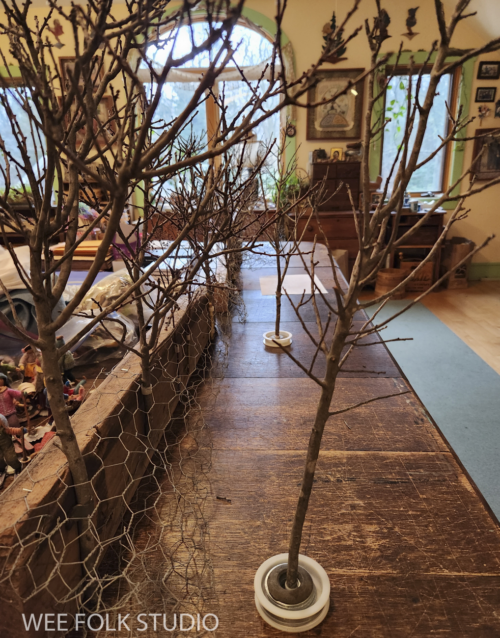 I constructed wood and chicken wire supports for the snow bank and trees, which I tested out on the big oak table in my studio. Bayberry branches, with their densely packed branches are the perfect scale for a scene like this.