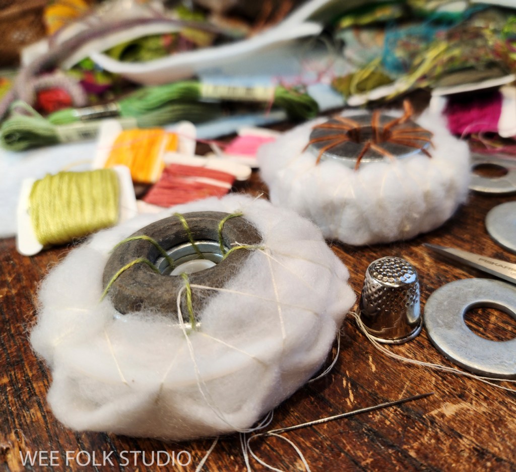 For the free-standing trees, I made weighted stands from plastic wire spools and a stack of metal washers, which I padded with stuffing and covered with white felt.