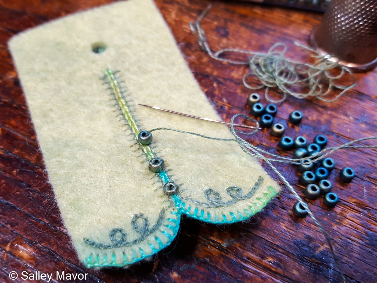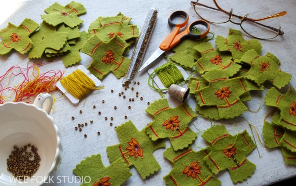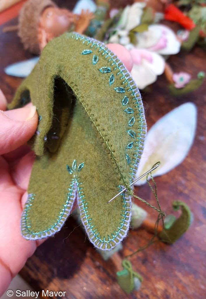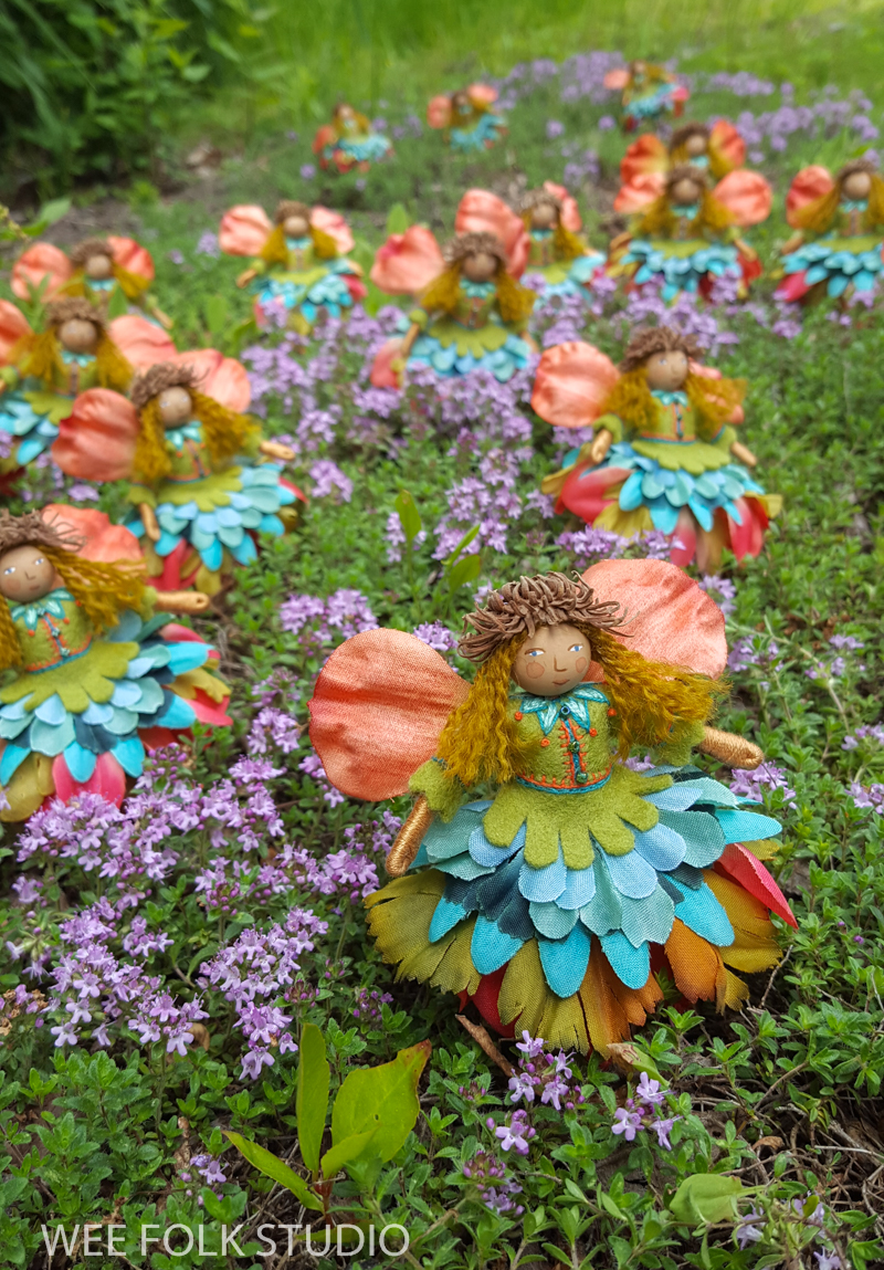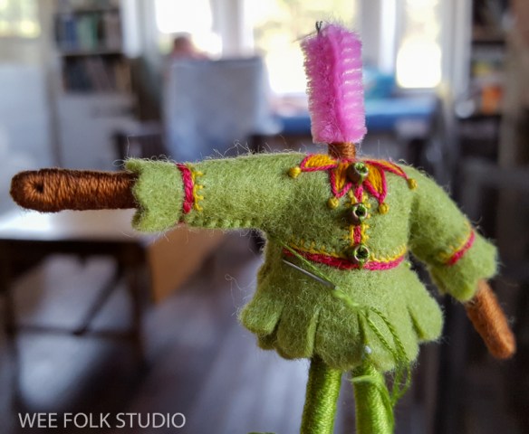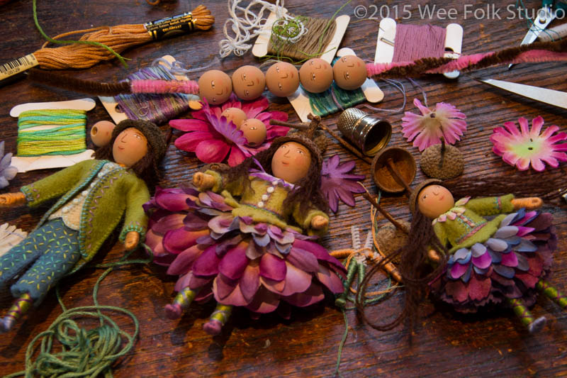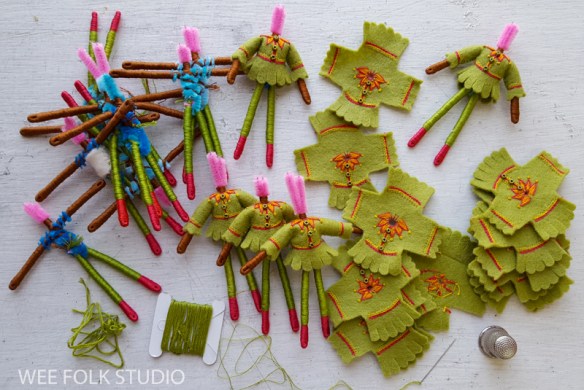 They’re basically the same fairies from my how-to book of doll projects, Felt Wee Folk – New Adventures. During the train trip, I was able to complete the most time consuming steps, like embroidering felt peplum jackets and wrapping pipe-cleaner bodies.