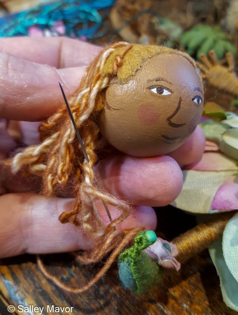These fairies have a different hair material than I’ve used before. Instead of wool fleece, I used single ply, fingering weight Merino yarn, which is easy to braid. Unfortunately, Flying Finn Yarns, the small cottage industry I bought it from, is not currently in business.