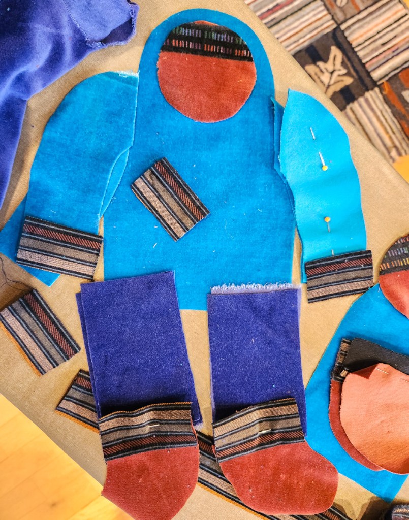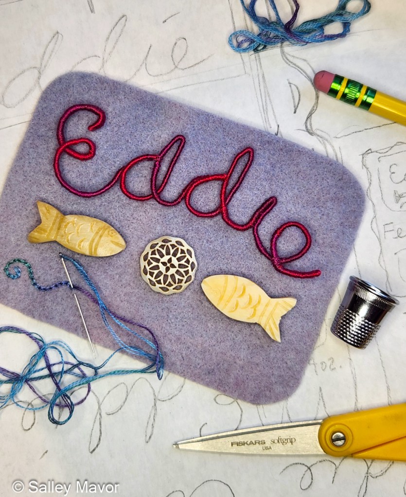 After choosing a color scheme and picking out pieces of felt and thread, I wrote out Eddie’s name in cursive handwriting with a pencil on paper. Fortunately, his name could be written in one continuous line, which doesn’t always happen. I then wrapped a length of DMC memory thread (a kind of wire) with 3 strands of variegated embroidery floss (see video below). Using the drawing as a template, I bent the wire to form his name and stitched the letters together where they touched.