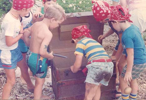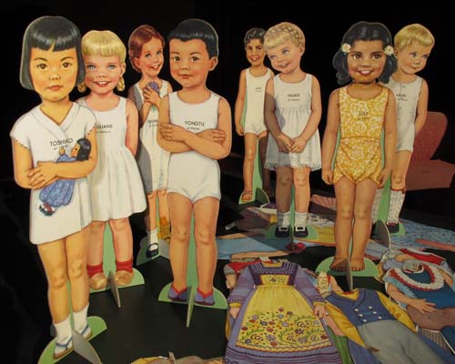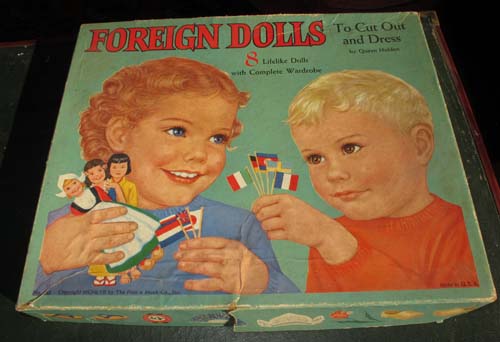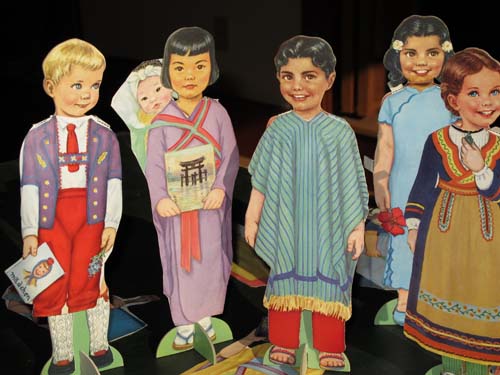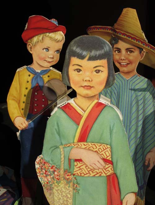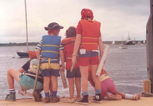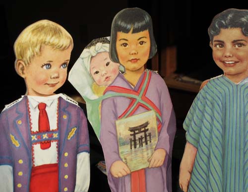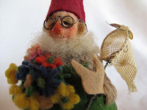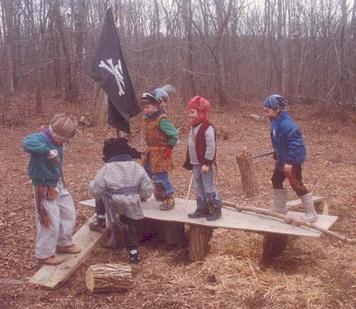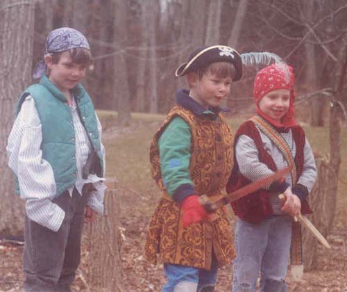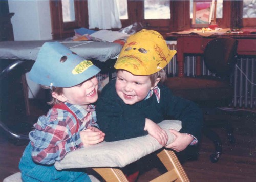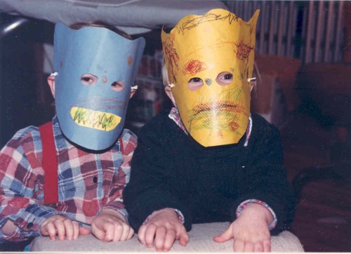 Judy edited the manuscript and I worked on the book whenever I could. The advance payment wasn’t enough to pay for daycare, so I figured out other ways to set aside time to work. I would spend a few hours stitching every evening, after the boys were read to and put to bed. During the day I was part of a coop arrangement, where I’d watch 2 other boys one morning a week and mine were taken care of 2 mornings. This picture shows Ian and his friend Sam in my studio wearing monster masks.
