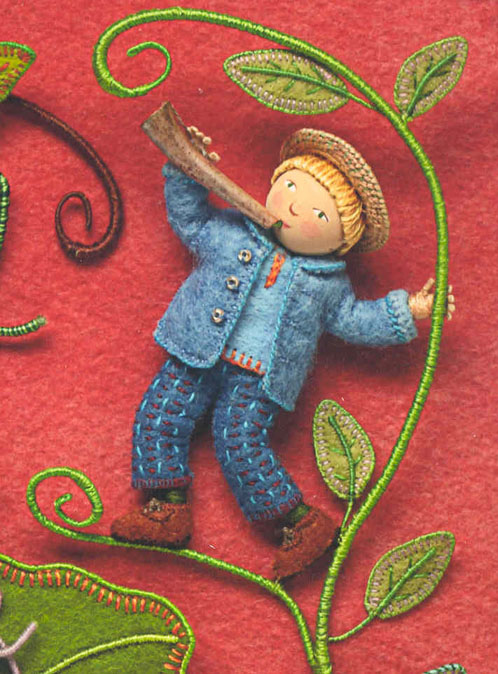 The new book, Pocketful of Posies: A Treasury of Nursery Rhymes includes many cats made in my new Halloween costume style. The head is a wooden bead, with face painting and a felt hood with ears attached. The cat’s paws and chest are whitened with acrylic paint. The fiddle is felt, with a thread-wrapped wire neck and bow. The illustration’s existing brown border was wide enough to cut in a wavy pattern, so I didn’t add another felt border. After several tries with different colors, I chose a blue pima cotton for the blanket stitched edging.