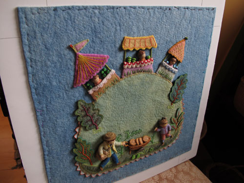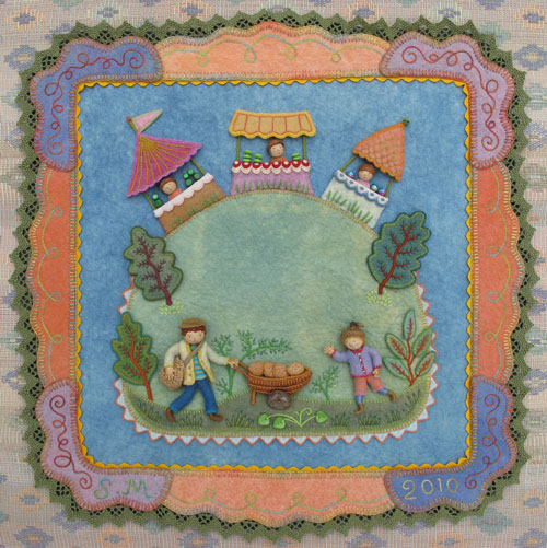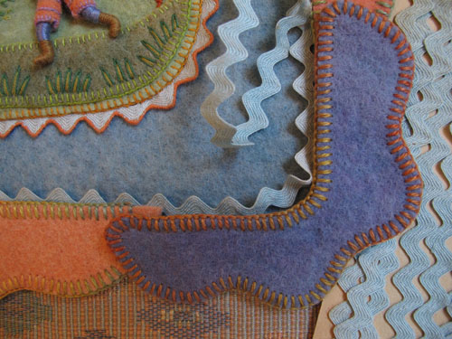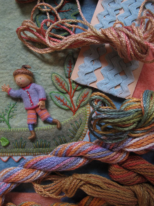 The original fabric relief is small (8 1/2″ square) and was enlarged to the printing size of 10″. Sometimes I want to have figures that are larger than wee folk size, so I have them blown up a bit. I made the original Jumping Joan as large as I could, using this technique (about 5″). The floss wrapped arms and legs don’t look right any bigger.