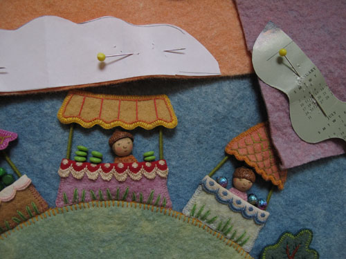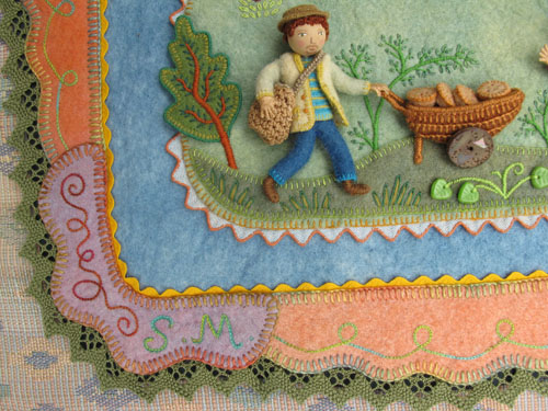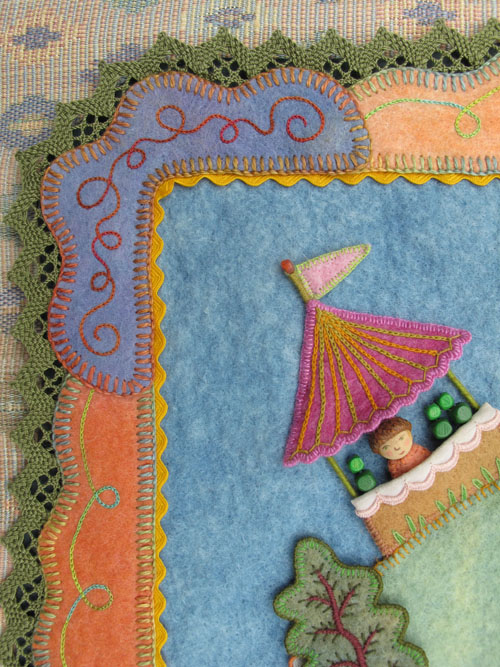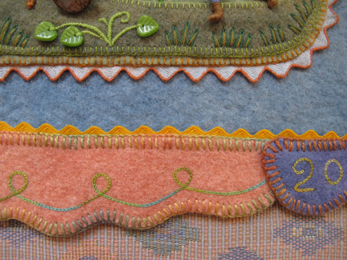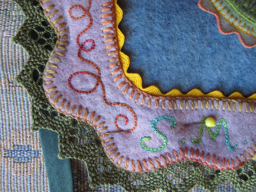 Here are the top corner pieces, with a chain stitched curly cue line.