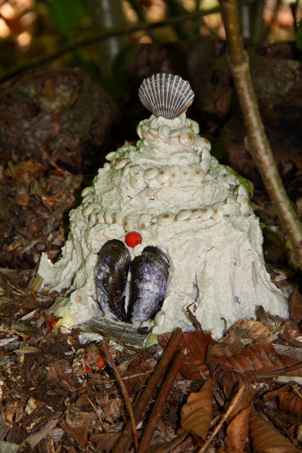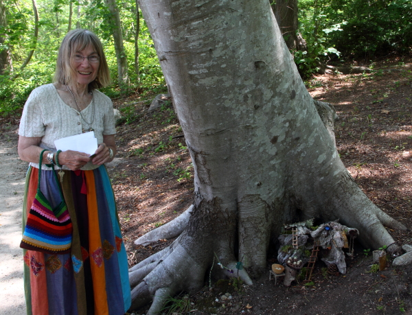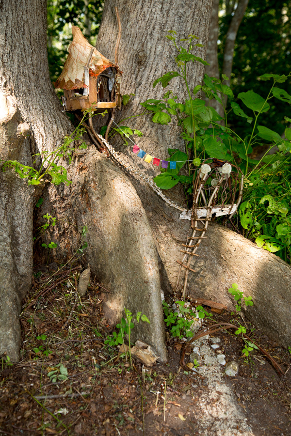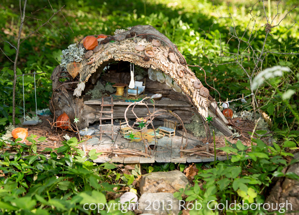 Sheila Payne was the first person I thought of when making a list of artists for the exhibit, way back in the winter. She has been making little abodes around her own house for decades and puts on the best fairy tea parties. When asked what she would make for this show, she replied, “Oh, just a standard fairy house.” I have known Sheila for 50 years and there is nothing standard about her!