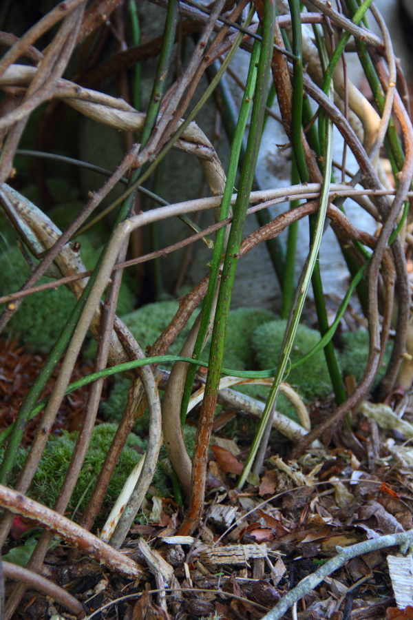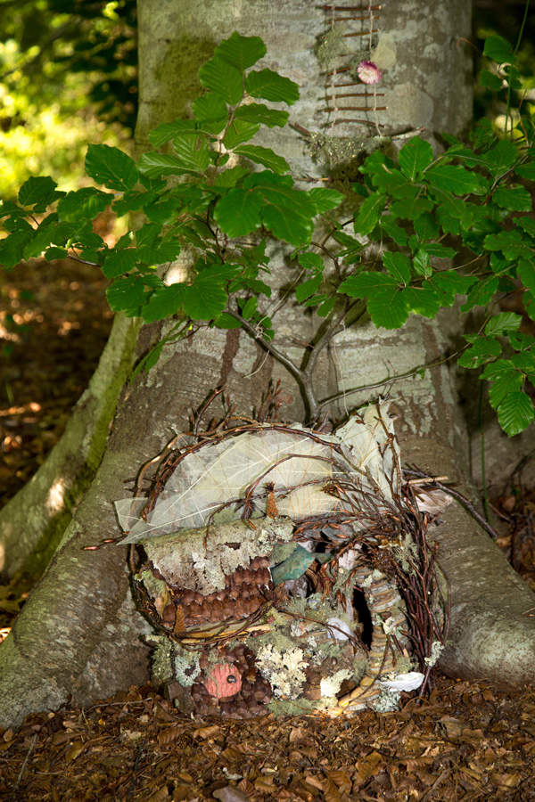 The Fairy Houses of Beebe Woods exhibit continues to draw visitors, rain or shine. One of the structures that has held up well through the thunder storms of the past week is Basia Goszczynska’s extraordinary “Golden Dwelling”. She constructed her cozy house out of saplings, moss and lichen on site, between the roots of a giant beech tree.