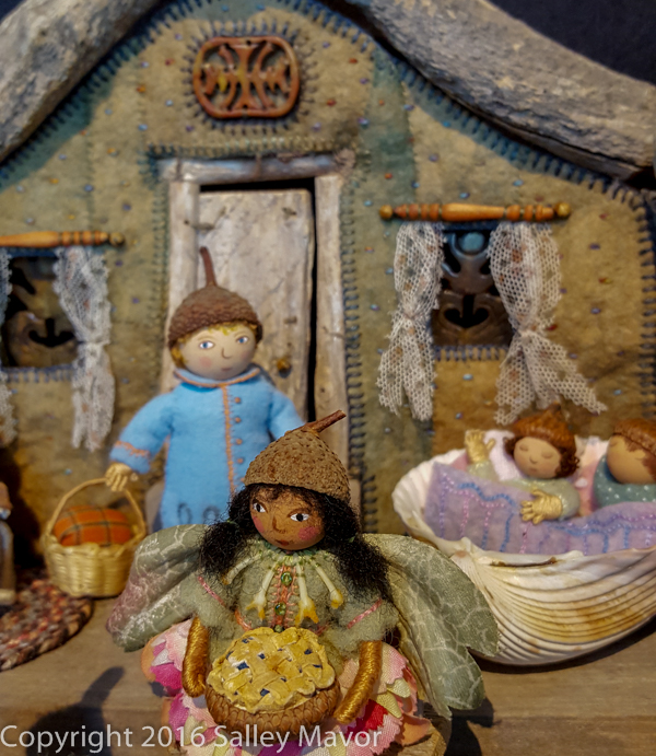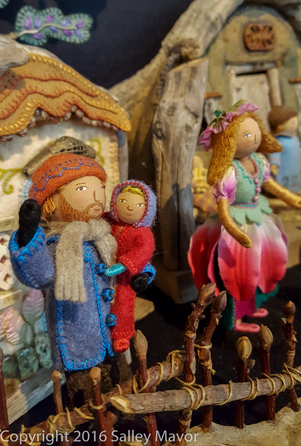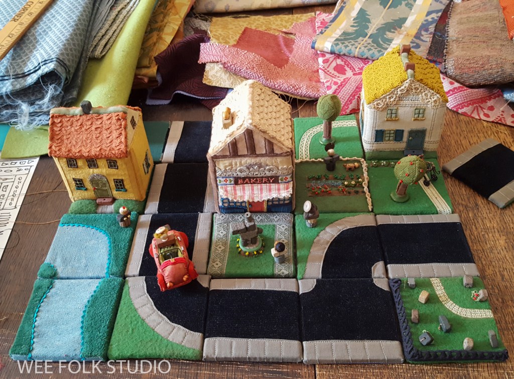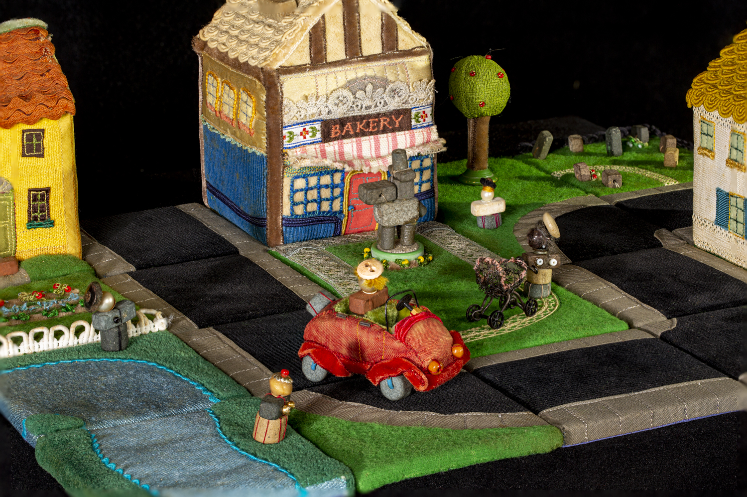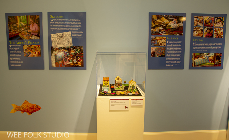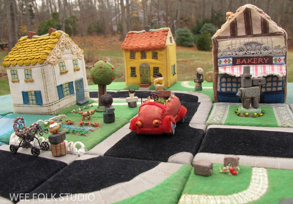 I’m writing about the village now because it’s included in my exhibition “Bedtime Stitches” at the Cahoon Museum through Dec. 19, 2020. That’s just 1 more week! Click here for hours, registration and Covid safely information. The village is one of several extra items that will only be shown at the Cahoon and will not travel with the touring exhibition of 18 original framed sculptural embroideries for my picture book, MY BED. To see the schedule of participating museums, click here.