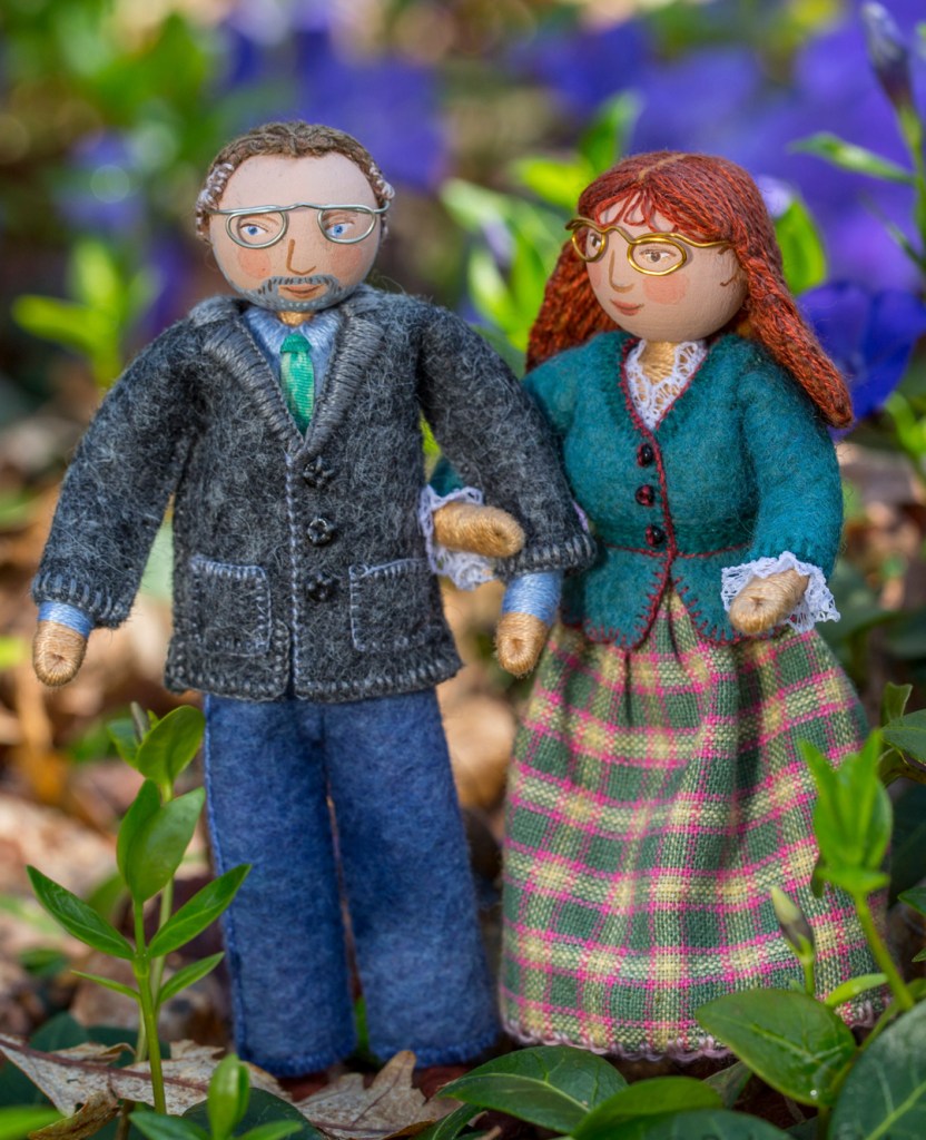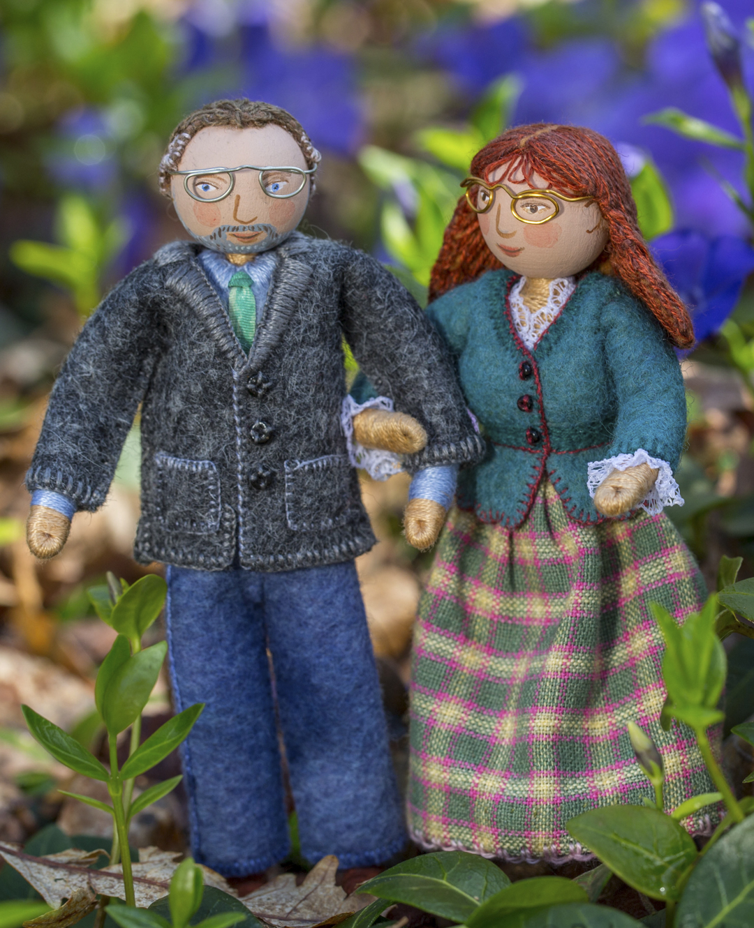 My friends Glen and Susan sent this photo after they went to see the exhibition yesterday. Don’t they look handsome and color coordinated, masks and all? I made them this pair of dolls when they got married a few years ago.