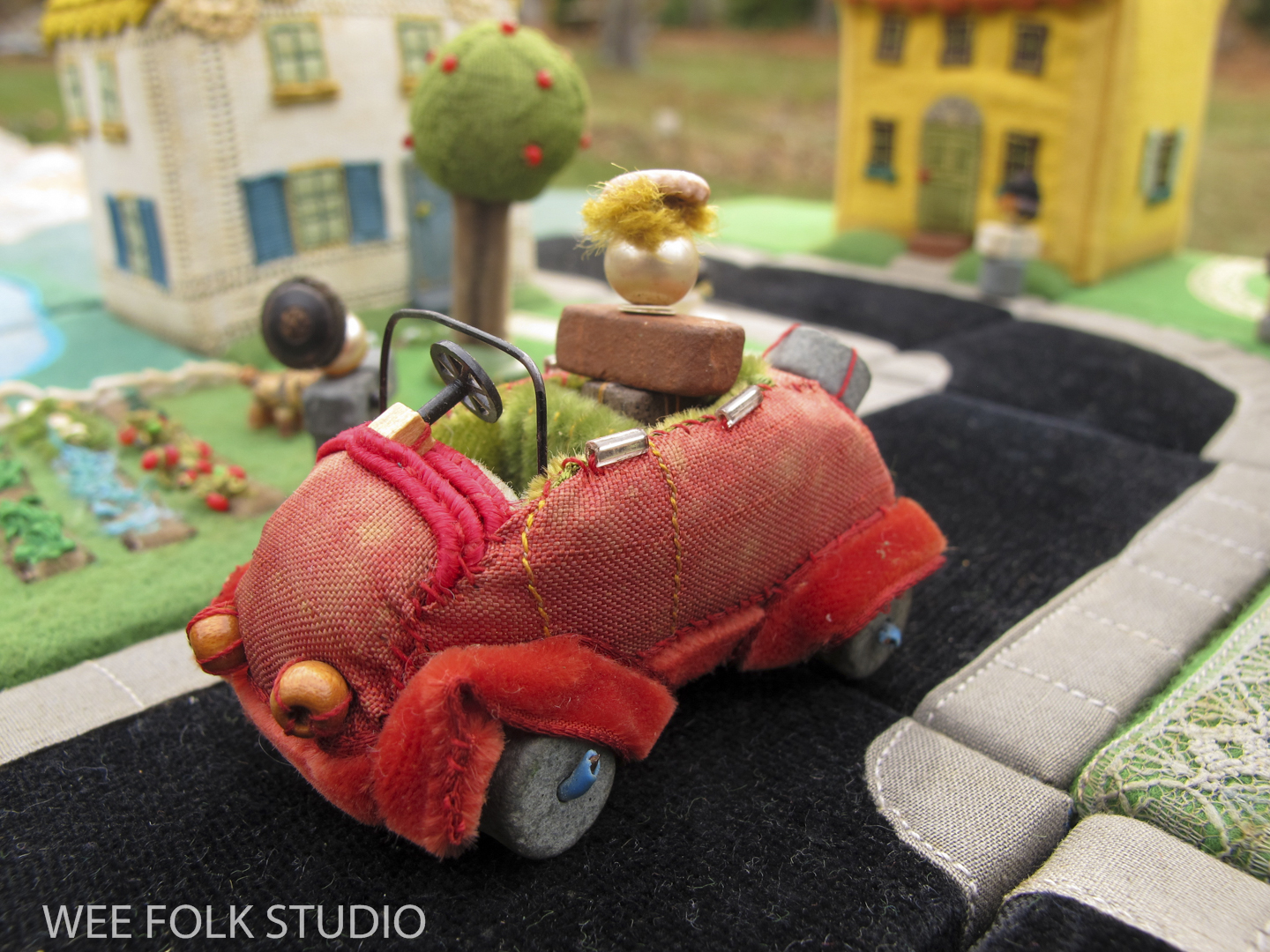 I most likely used cardboard to form the car’s basic shape and stuffed the hood to make it puff out in front. The wheels are clay beads – you can see the insulated wire axle sticking out. The seat lining and fenders are made with velvet ribbon and the steering wheel is a plastic miniature car wheel.