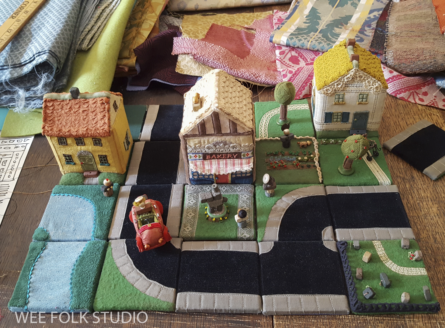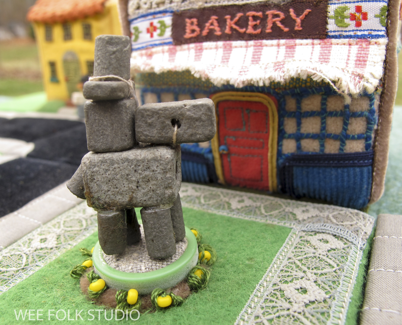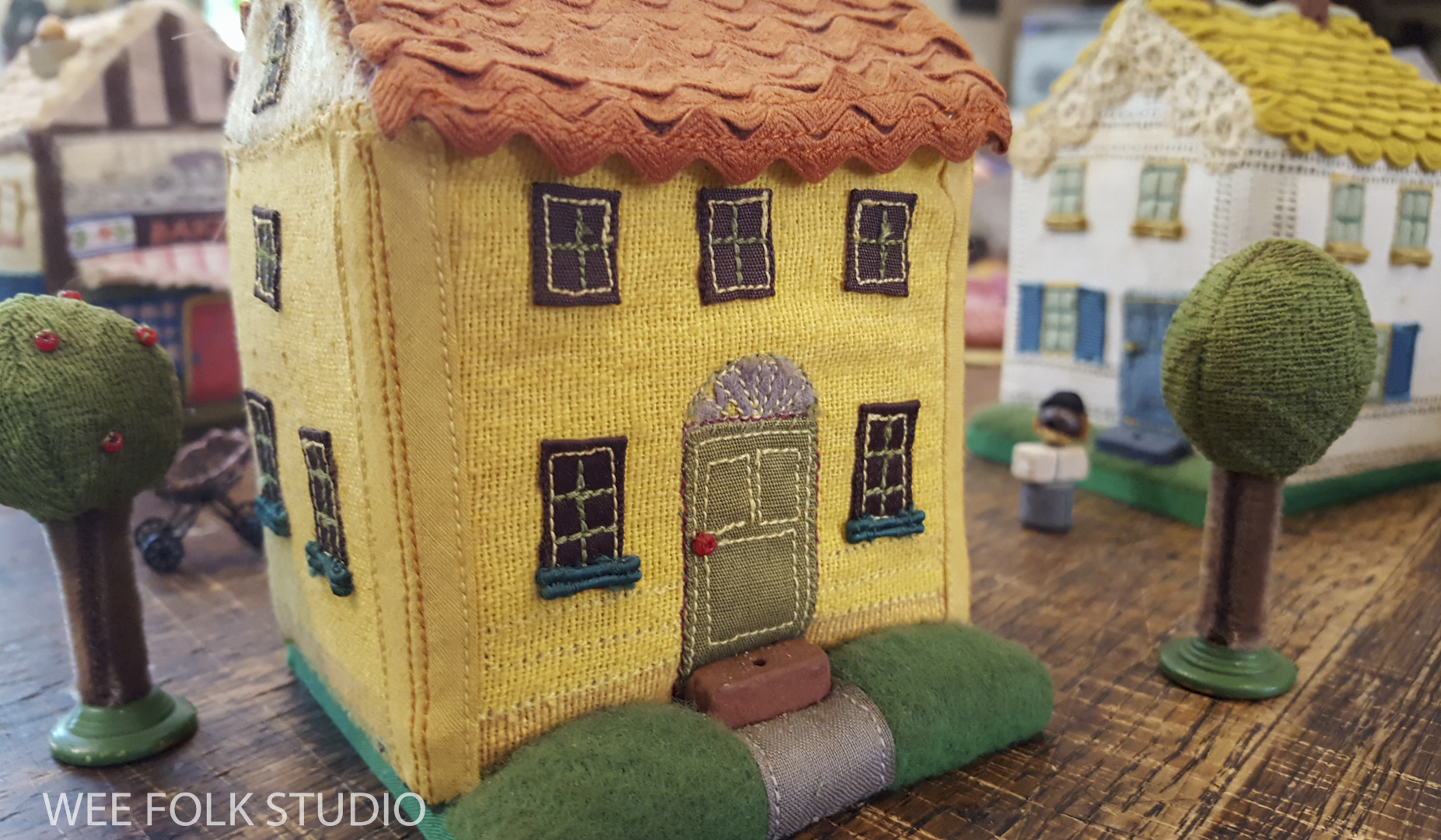 I hand embroidered the bakery sign and hand stitched the buildings to the fabric covered squares.