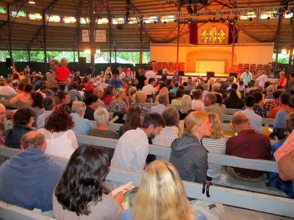 The purpose of our visit to Oak Bluffs was to attend an evening of storytelling presented by The Moth radio program. If your local NPR station airs The Moth, you know how inspiring and moving the stories can be. Last summer, Martha’s Vineyard writer, Cynthia Riggs told a most compelling story that has by now been heard all over the world. It is worth hearing her tale, so click the link on her name. She returned this year and gave an update of her adventure to a cheering crowd of 1700. Here’s the inside of the Tabernacle while we were waiting for the storytelling performances to begin. It was quite an evening!