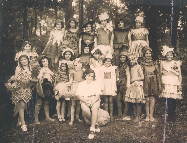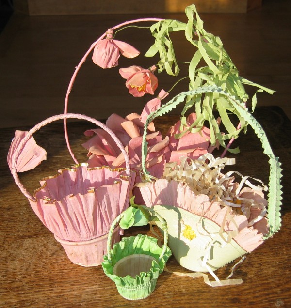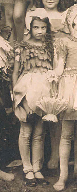 These girls seem transformed by their costumes and their personalities really come through in the picture. The amount of detail in the outfits is impressive, with each one being unique, right down to the little caps. I love the baggy knees on the cotton stockings. This must have been taken about 1920, judging by the hair and clothing styles. The crepe paper basket being held by one of the girls is similar to some party baskets that I found in my grandmother’s things.