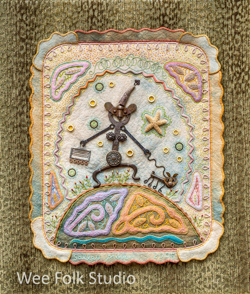 I started making Walking the Dog by spreading out a bunch of metal parts I’d been collecting onto my work table. Several of the objects, like the wrenches and drawer pull, I’d found a few years earlier at the Liberty Tool Company in Liberty, Maine. I had no plan and tried to approach the project as an open exercise that may or may not lead to something tangible. I started playing around with the shapes and a figure emerged, then a dog made from an old key and a lamp pull chain leash. Later I added a handbag to balance the dog on the other side. Earrings and a brooch became her breasts and tummy. Then the figure needed a place to be, so I made her a hillside out of wool felt. One thing led to the other, with the earth needing a felt atmosphere, which then needed to be contained with ricrac. I finished it off with lots of French knots, chain-stitched curly ques, and added a border made from a long section of antique button loops. Then I mounted the felt piece to some leopard-like spotted upholstery fabric. It ended up being a very satisfying experience, with something to show for it. Thank you, Mum.