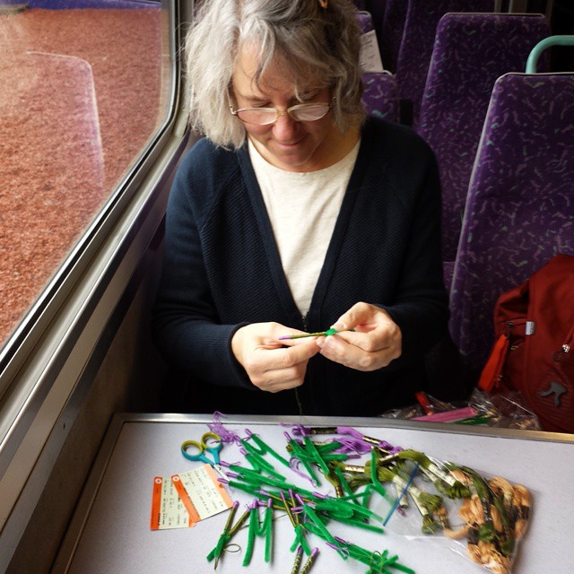 They’re basically the same fairies from my how-to book of doll projects, Felt Wee Folk – New Adventures. During the train trip, I was able to complete the most time consuming steps, like embroidering felt peplum jackets and wrapping pipe-cleaner bodies.