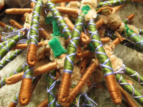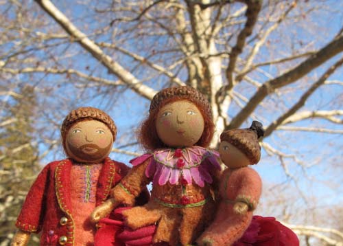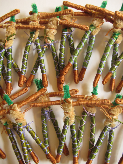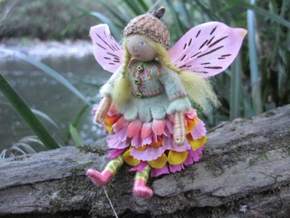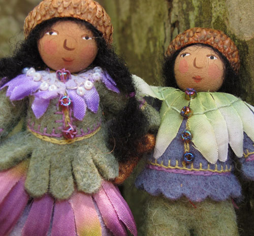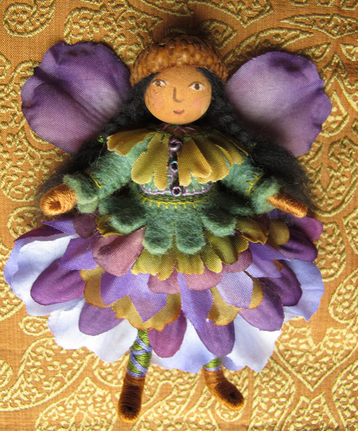 For the past few months, I’ve been wrapping legs, sewing felt tunics and painting faces for a new Ltd. Edition fairy doll. During those months, I found it harder and harder to find the time to work on the 25 dolls and kept putting them aside. Even though I still like making them, I’d rather be working on other projects, so I made the decision that PANSY would be the last fairy design in this series. It’s true, I won’t be making any more dolls to sell. Last week, I sent an e-mail announcement to those who asked to be put on a mailing list and all 25 have already sold. It has been a joy to create the dolls and I thank all of you who have purchased other wee folk characters. Over the past 8 years, I’ve made 21 different designs and sewed 750 individual dolls.