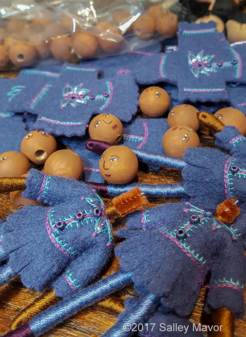 They’re basically the same fairies from my how-to book of doll projects, Felt Wee Folk – New Adventures. During the train trip, I was able to complete the most time consuming steps, like embroidering felt peplum jackets and wrapping pipe-cleaner bodies.