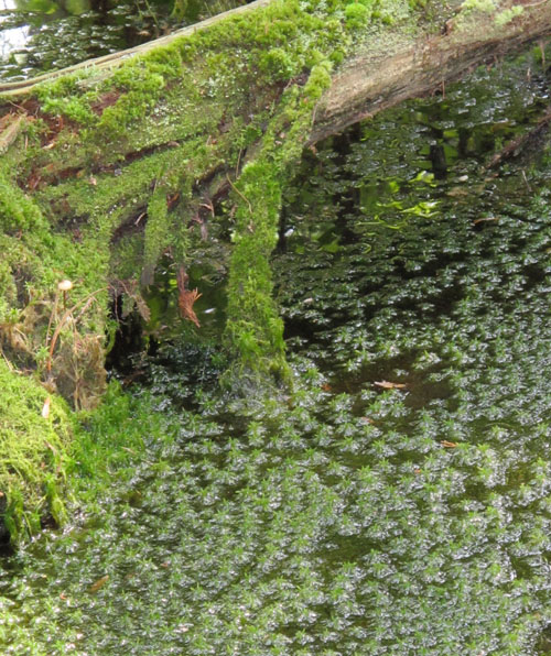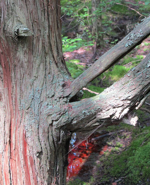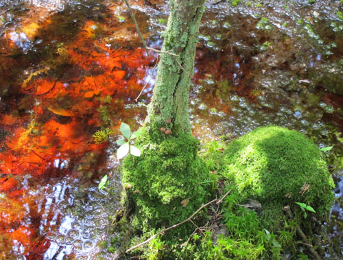 The resilient cedars have returned, but the trees are no where near the 3′ in diameter that the settlers cut. The green moss-covered ground contrasted with the red tinted swamp water. A biologist friend told me that the orangey red color appears when the iron in the decaying material is oxidized.