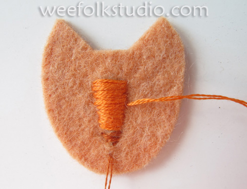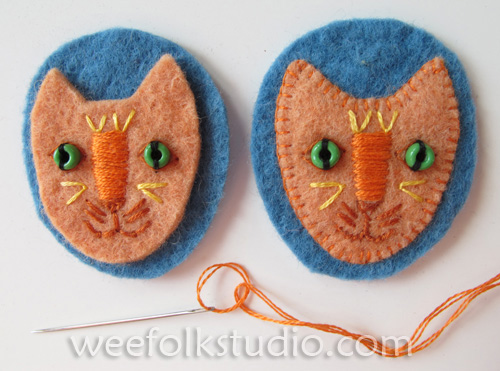 Step 5: With double strands of orange floss, stitch the cat face to the blue middle piece, blanket stitching all around the outside edge of the cat face