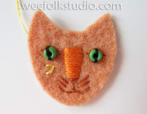 Step 4. Stitch the mouth and whiskers with double strands of brown floss. Sew the green bead eyes onto the cat face with black floss, stitching vertically to make the eye’s pupil. Stitch an outline around the bead eyes with a single strand of brown floss. With a double strand of gold floss, use a fly stitch to make cat’s stripes.