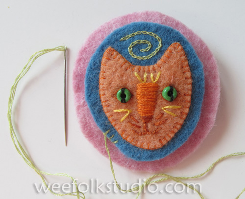 Step 6. With a single strand of light green floss, chain stitch the curly queue on the blue felt, above the cat face. Then, with double strands of light green floss, blanket stitch the blue middle section onto the pink piece.