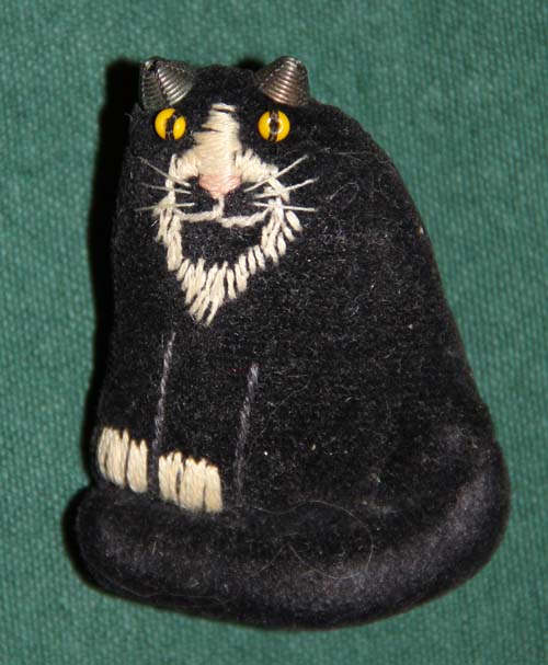 I gave a talk today at the First Congregational Church in my home town of Falmouth, MA. The audience included many needle workers who were very curious about how I made some of the pieces I showed in my slide presentation. Jo Ann Coleman brought a black velveteen cat pin to show. It’s one I had made over 30 years ago for her son, who was a classmate growing up in Falmouth. In the late 70’s, early 80’s, I made custom pins for customers who send photos of their cats. I remember seeing the picture of this big black one with a white beard. It’s wonderful that these pins I made decades ago keep coming back into my life! You can read more about the pins here.