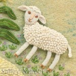 For the rabbit topiary, I cut separate parts out of dark green felt and embroidered branches and leaves. The eyes, nose, mouth and whiskers are wire wrapped with embroidery floss. I also sewed wire along the scalloped outside edge, so that the pieces could be bent and shaped. Two glass leaf beads make the eyes.