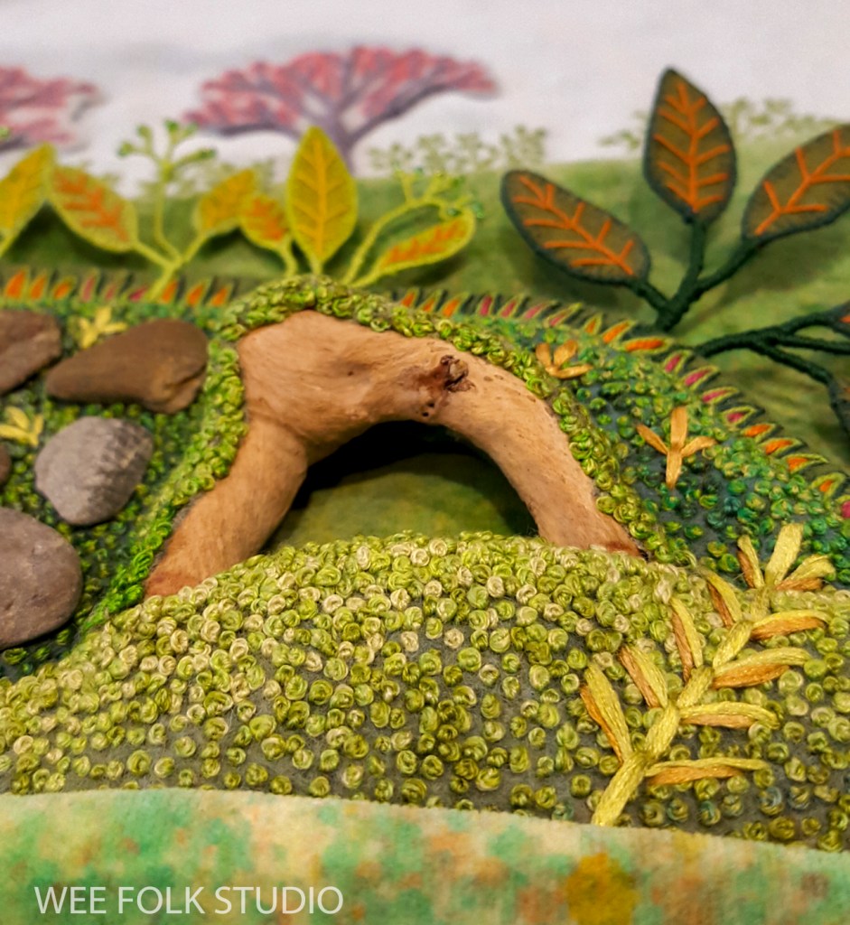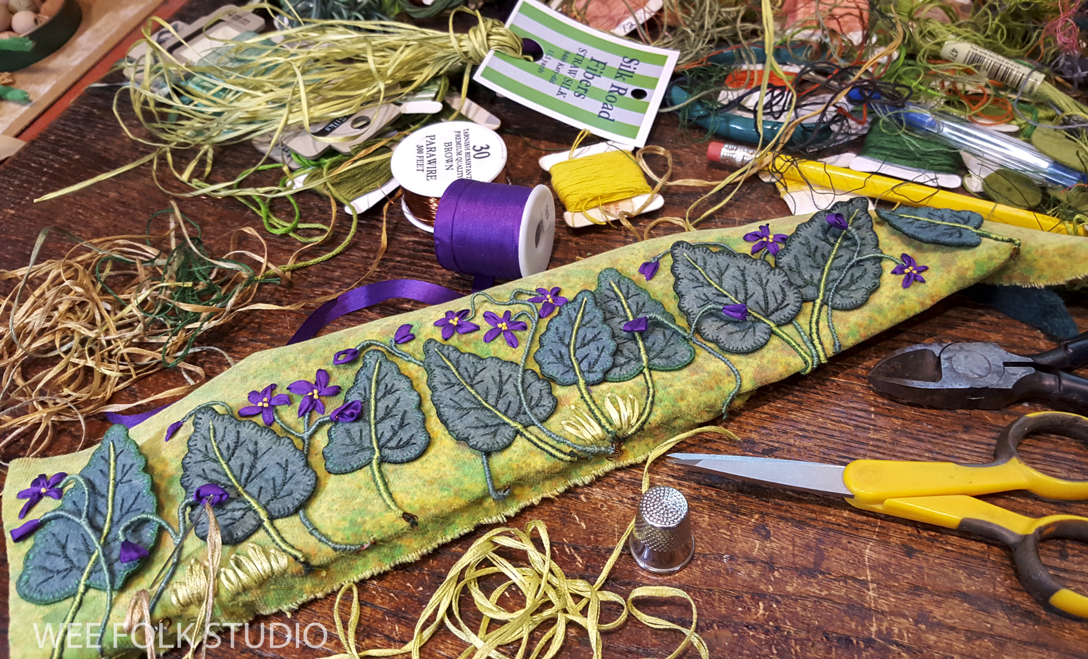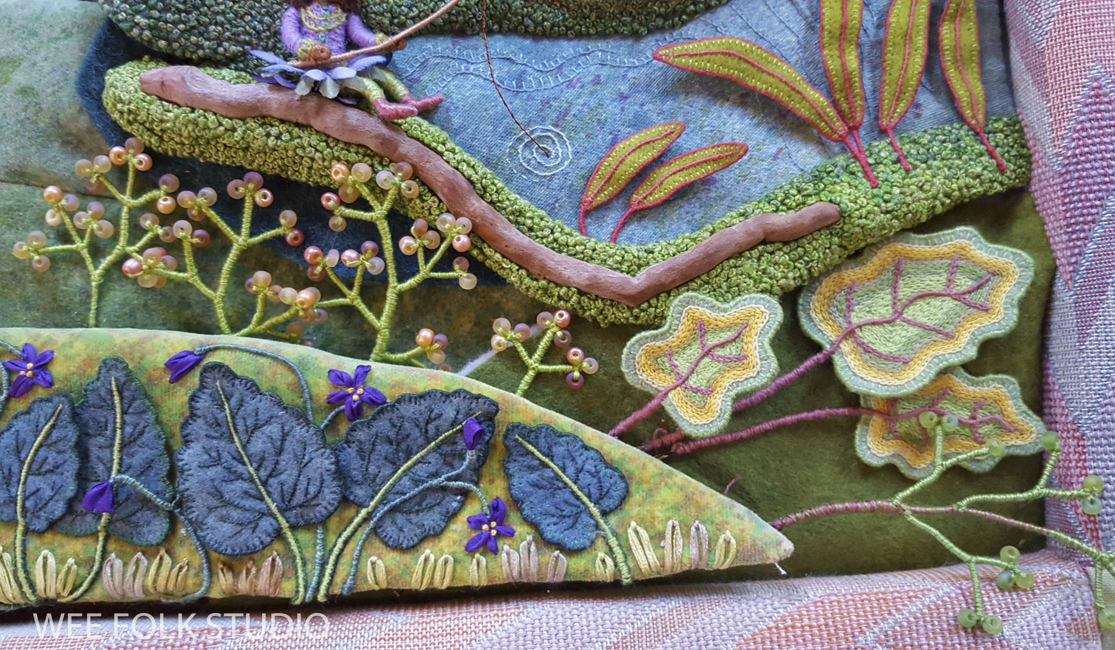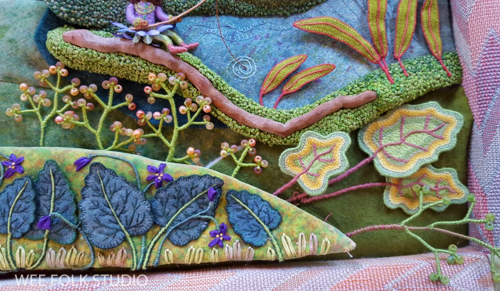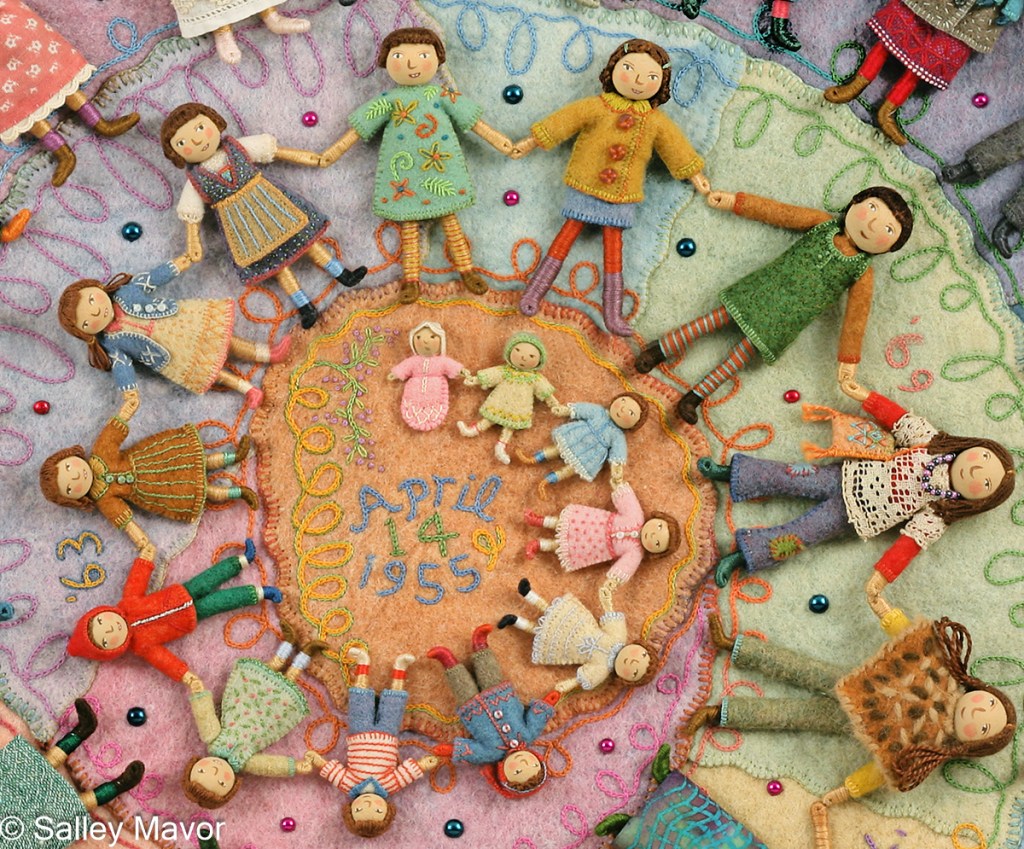 My Self Portrait shows a spiral of dolls, one for each year up to age 52, which was my age in 2007. My birth date is embroidered in the center. Yes, I’ll soon be turning 70! Each figure is dressed in an outfit I would have worn that year, taken from memories, family photos or my imagination. The figures range from 1 in. to 3 1/2 in. and are variations of the wee folk dolls in my how-to book, Felt Wee Folk.